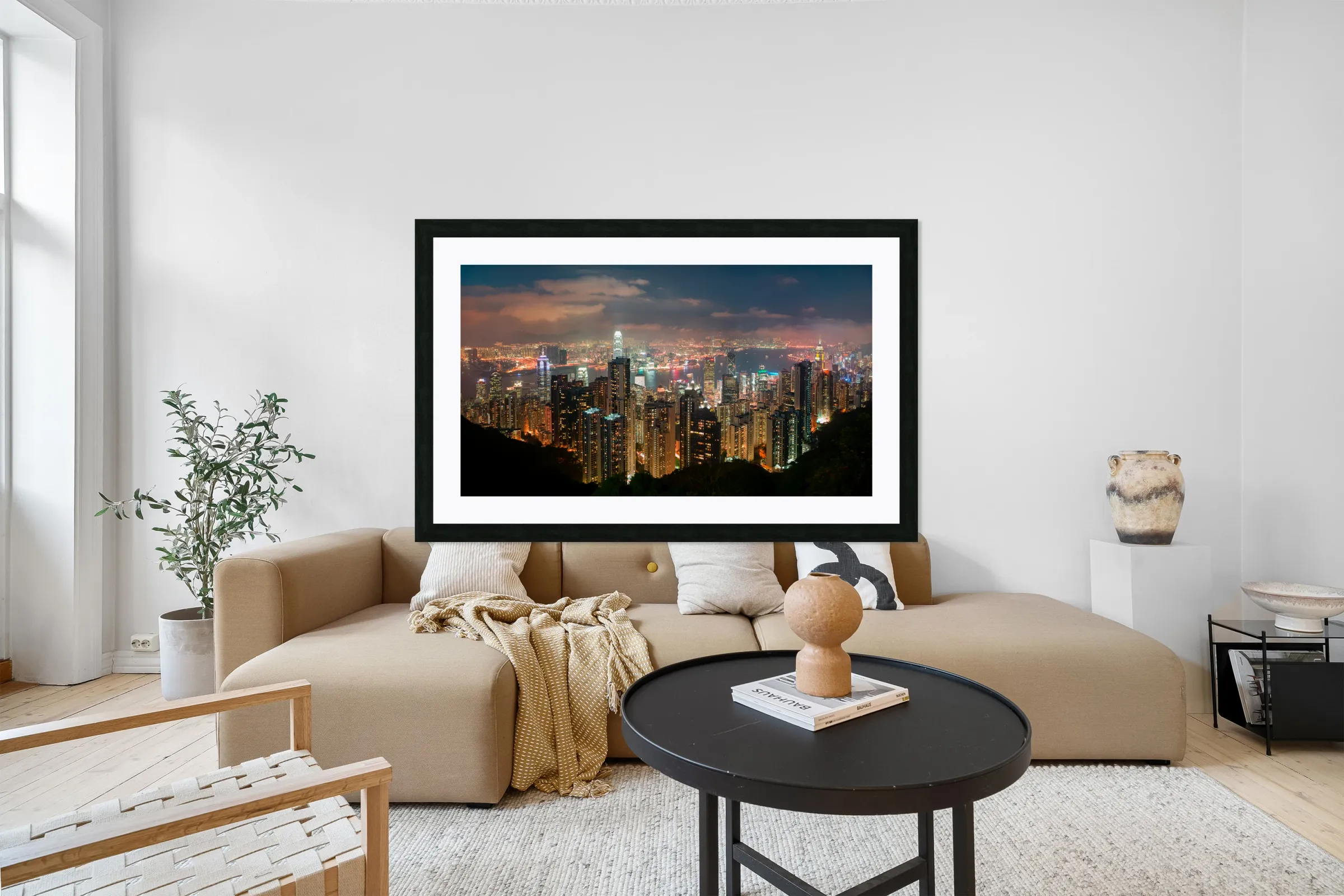 A high-angle aerial view of Hong Kong city at night, featuring the vibrant lights and skyline illuminated against the dark sky. The photograph captures the dense urban landscape and the glowing buildings of this bustling metropolis in China. A great photograph for travel enthusiasts, cityscape collectors, or those seeking to add a striking image of Hong Kong to their collection.