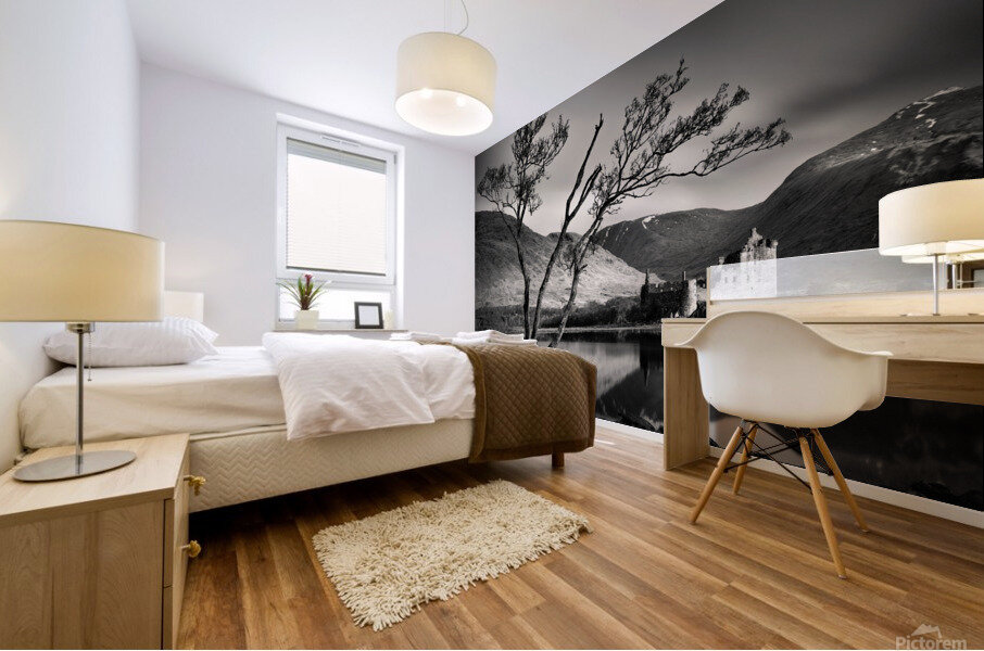 A monochrome long exposure photograph of Kilchurn Castle, captured on a serene spring morning in Argyll and Bute, Scotland. The image showcases the castle’s reflection perfectly mirrored in the still waters of Loch Awe, highlighting the tranquil beauty of the landscape. Ideal for those seeking a classic and tranquil depiction of Scottish highland scenery.