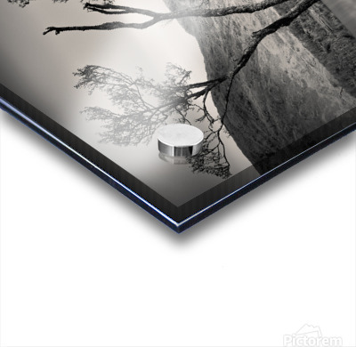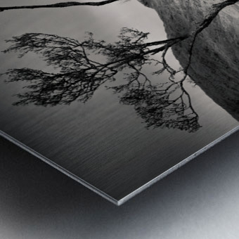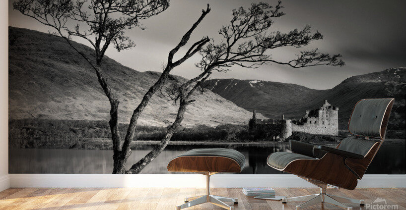A monochrome long exposure photograph of Kilchurn Castle, captured on a serene spring morning in Argyll and Bute, Scotland. The image showcases the castle’s reflection perfectly mirrored in the still waters of Loch Awe, highlighting the tranquil beauty of the landscape. Ideal for those seeking a classic and tranquil depiction of Scottish highland scenery.