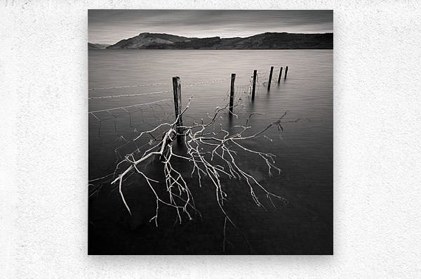 A tree branch stuck on a wire fence on the shore of Loch Avich, Scotland, UK.