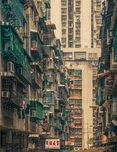 A congested residential neighbourhood tucked away in Macau's labyrinthine backstreets, China. The photograph captures densely packed apartments within a concrete jungle, showcasing the intricate and crowded urban landscape typical of Macau. Perfect for those interested in urban photography, architectural studies, or the chaotic beauty of city life.