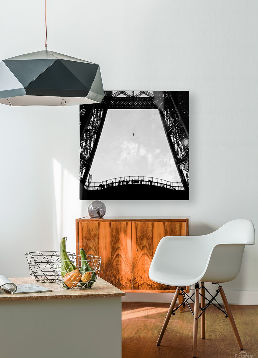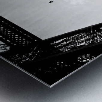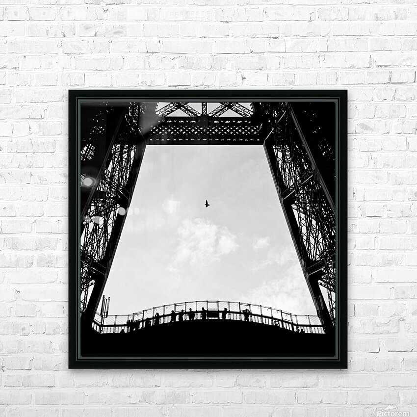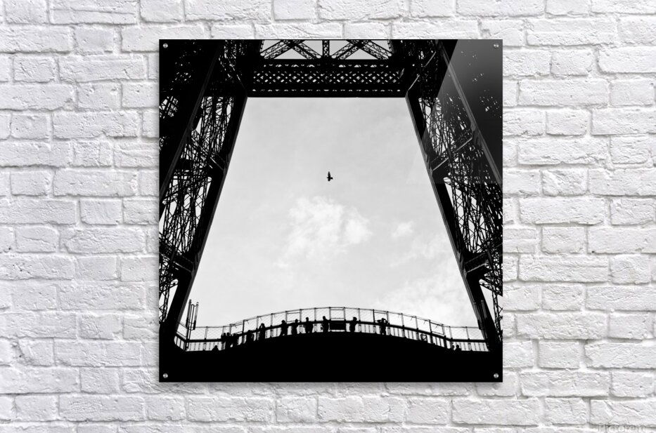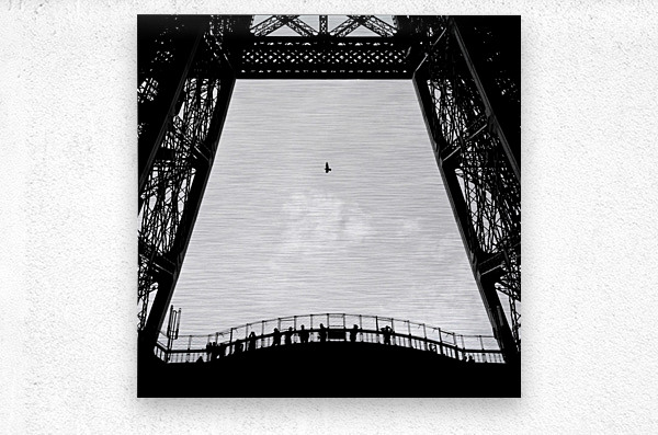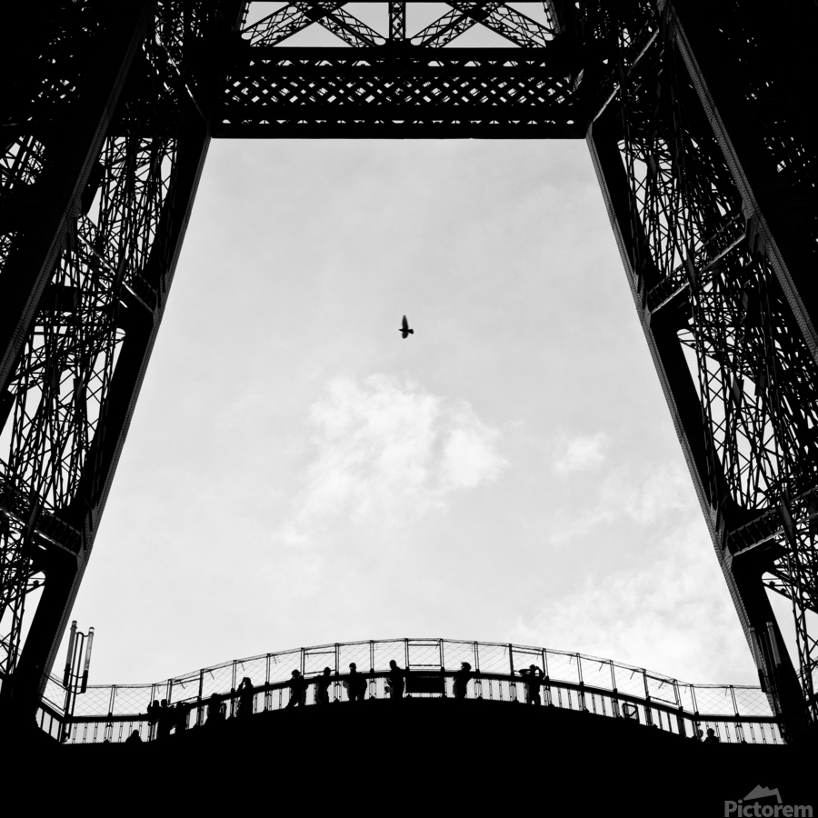 A lone bird flies over tourists silhouetted on the Eiffel Tower, Paris, France.