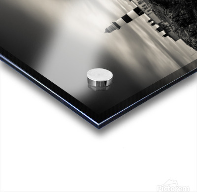 A monochrome photograph of Eilean Glas Lighthouse on the Isle of Scalpay, Outer Hebrides, Scotland. The image conveys a sense of calm yet dramatic atmosphere, with the stillness of the sea and the shifting movement of the clouds above. The lighthouse stands strong against a moody sky, creating a striking contrast with the soft waters surrounding it. A great photograph for those looking to capture the unique character and quiet beauty of Scotland's coastal landscape.