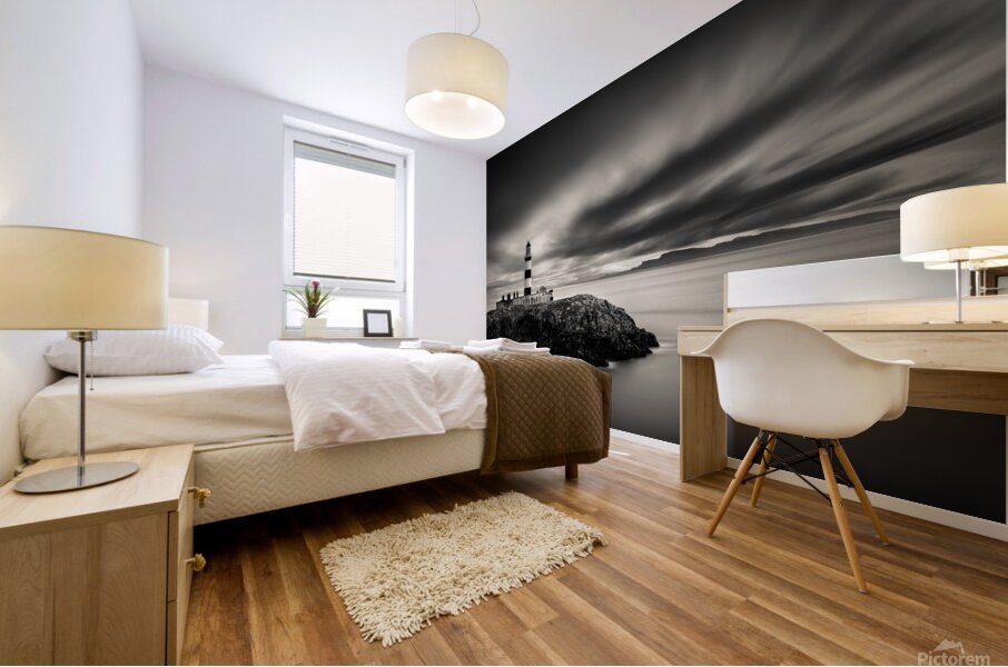 A monochrome photograph of Eilean Glas Lighthouse on the Isle of Scalpay, Outer Hebrides, Scotland. The image conveys a sense of calm yet dramatic atm...[+]