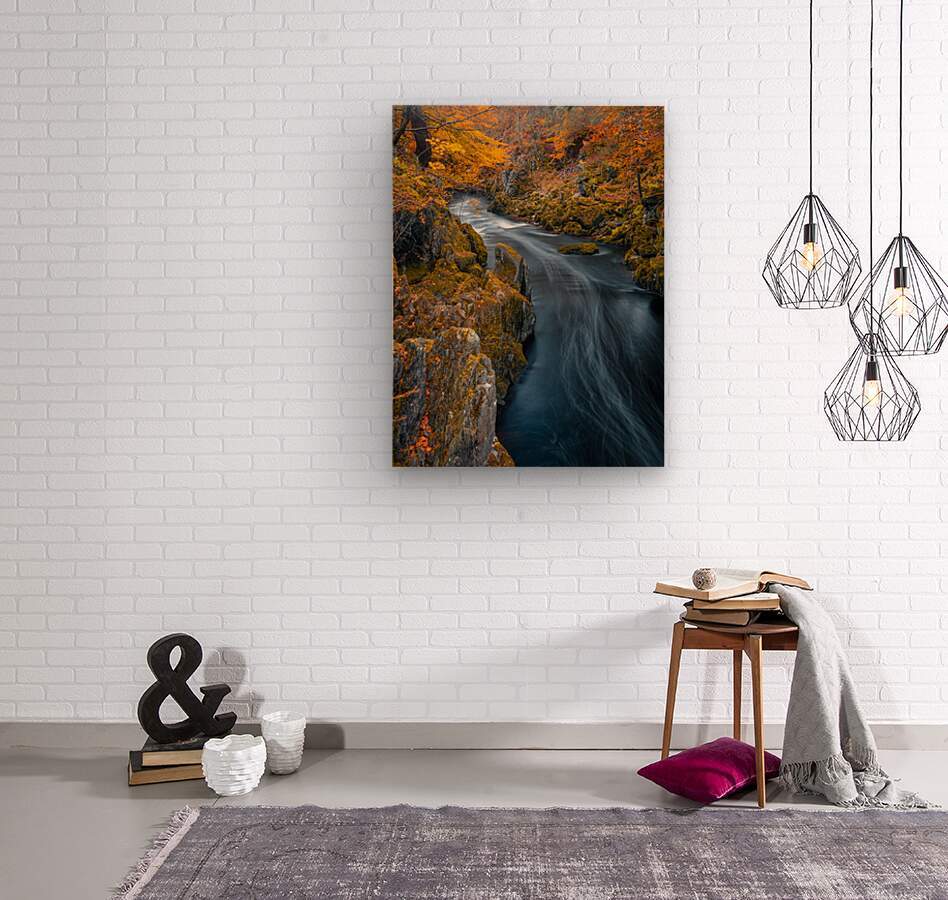 A captivating photograph of autumn colours along the River North Esk in Angus, Scotland. The river flows through a scenic creek, surrounded by rocks and vibrant trees. A long exposure technique captures the fluid movement of the water, creating a serene and dynamic scene. Perfect for nature lovers, home decor, or office spaces looking to bring the beauty of autumn indoors.