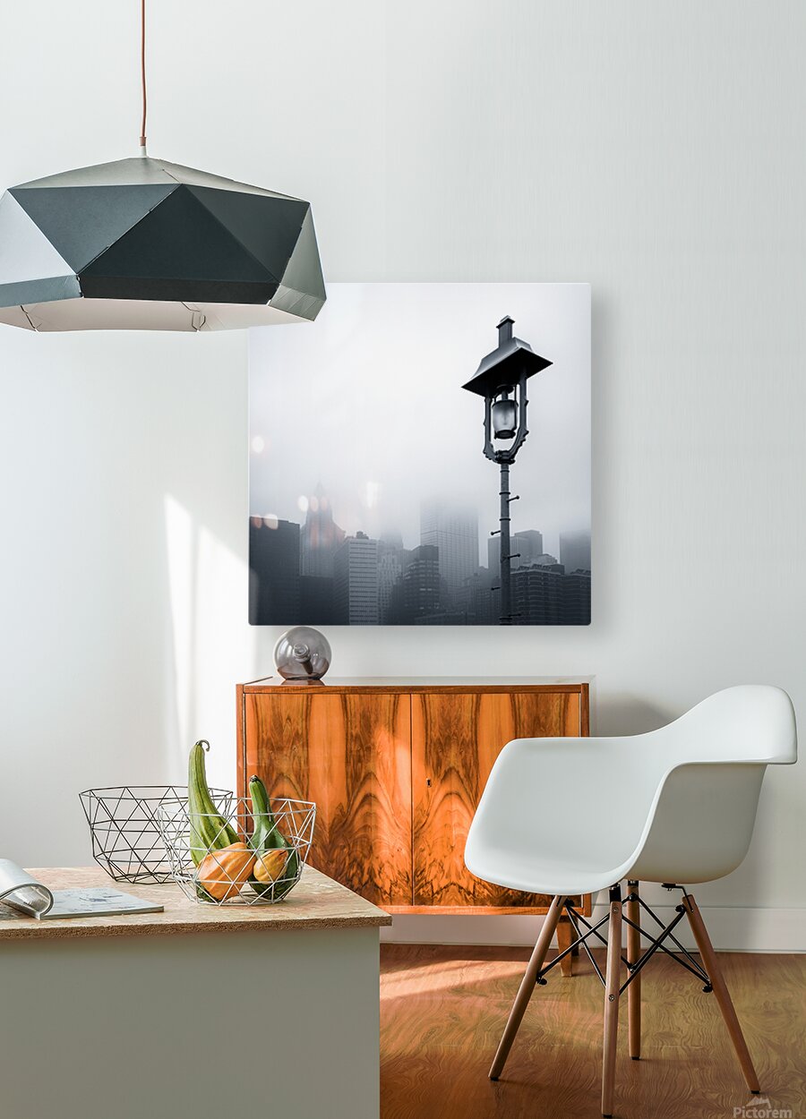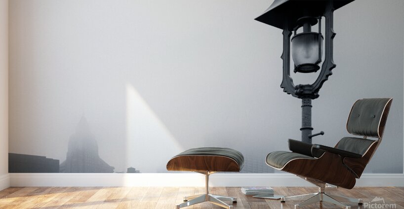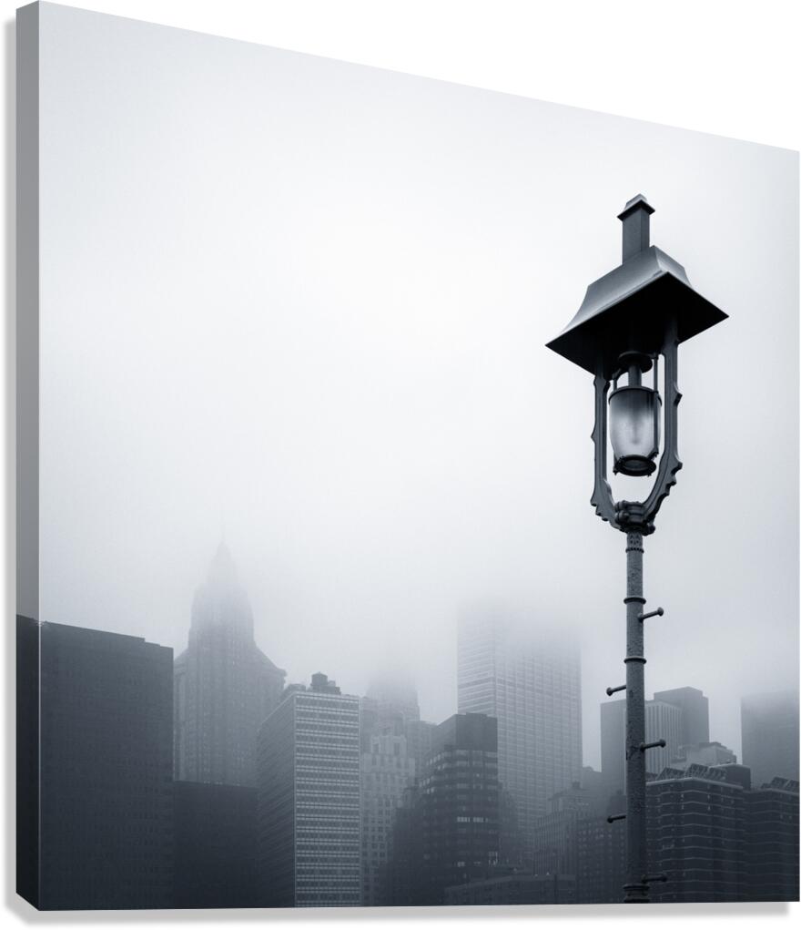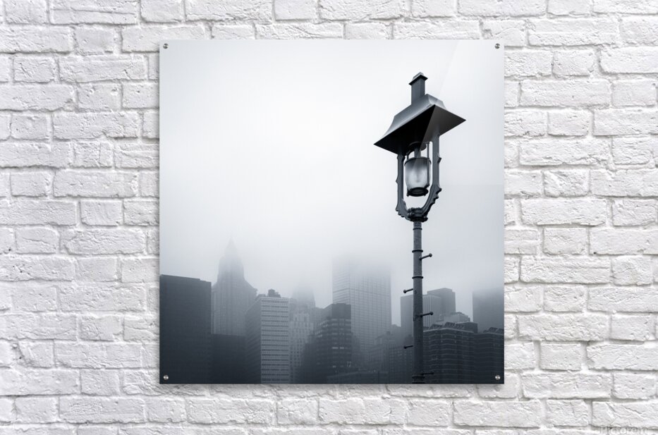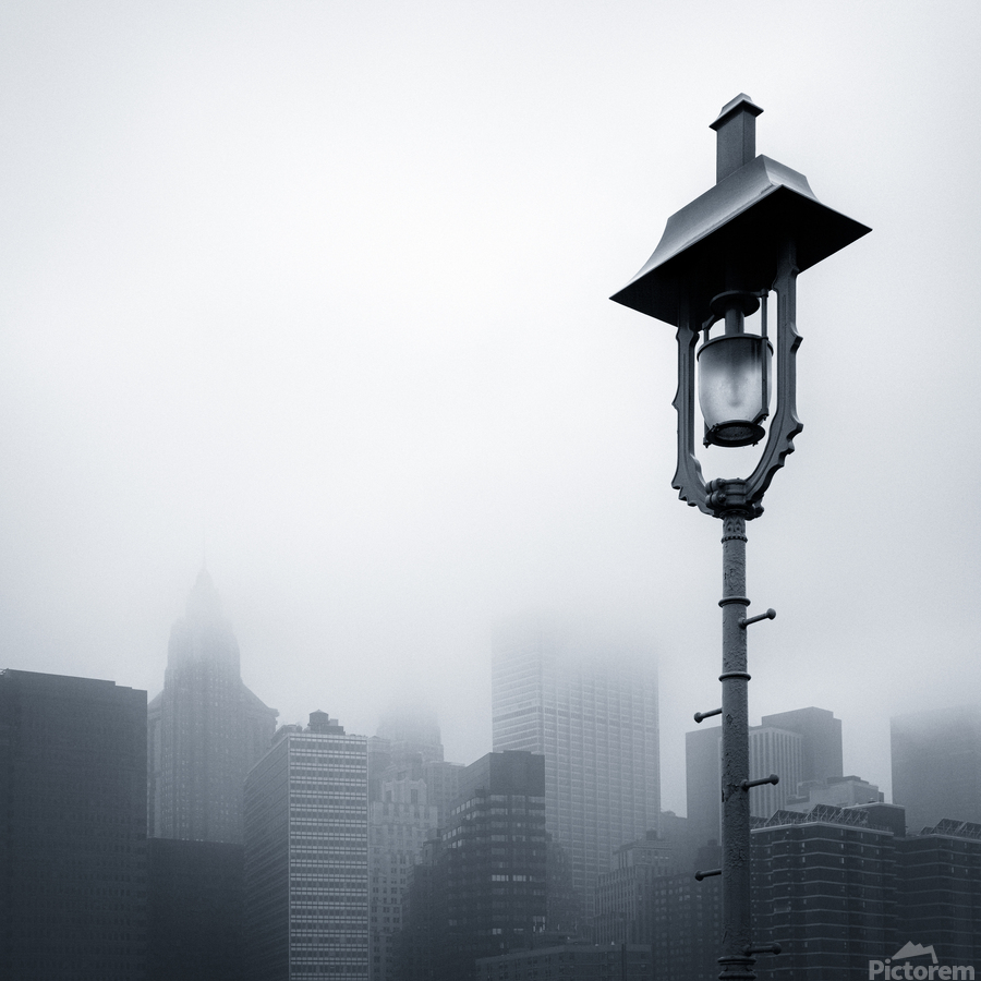 A monochrome photograph capturing the iconic view from the Brooklyn Bridge as mist envelops New York City. This striking image features the tops of skyscrapers obscured by fog, with one of the Brooklyn Bridge's lights prominently displayed in the foreground. The soft interplay of light and shadow emphasizes the ethereal quality of the scene. A great photograph for those seeking a dramatic and atmospheric representation of New York City's skyline.