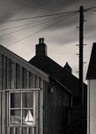 A toy yacht sits in a shed window in Footdee, Aberdeen, framed by the soft outlines of house roofs and chimneys in silhouette behind it. The monochrom...[+]