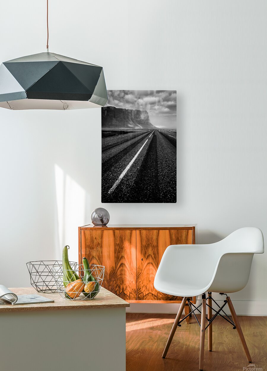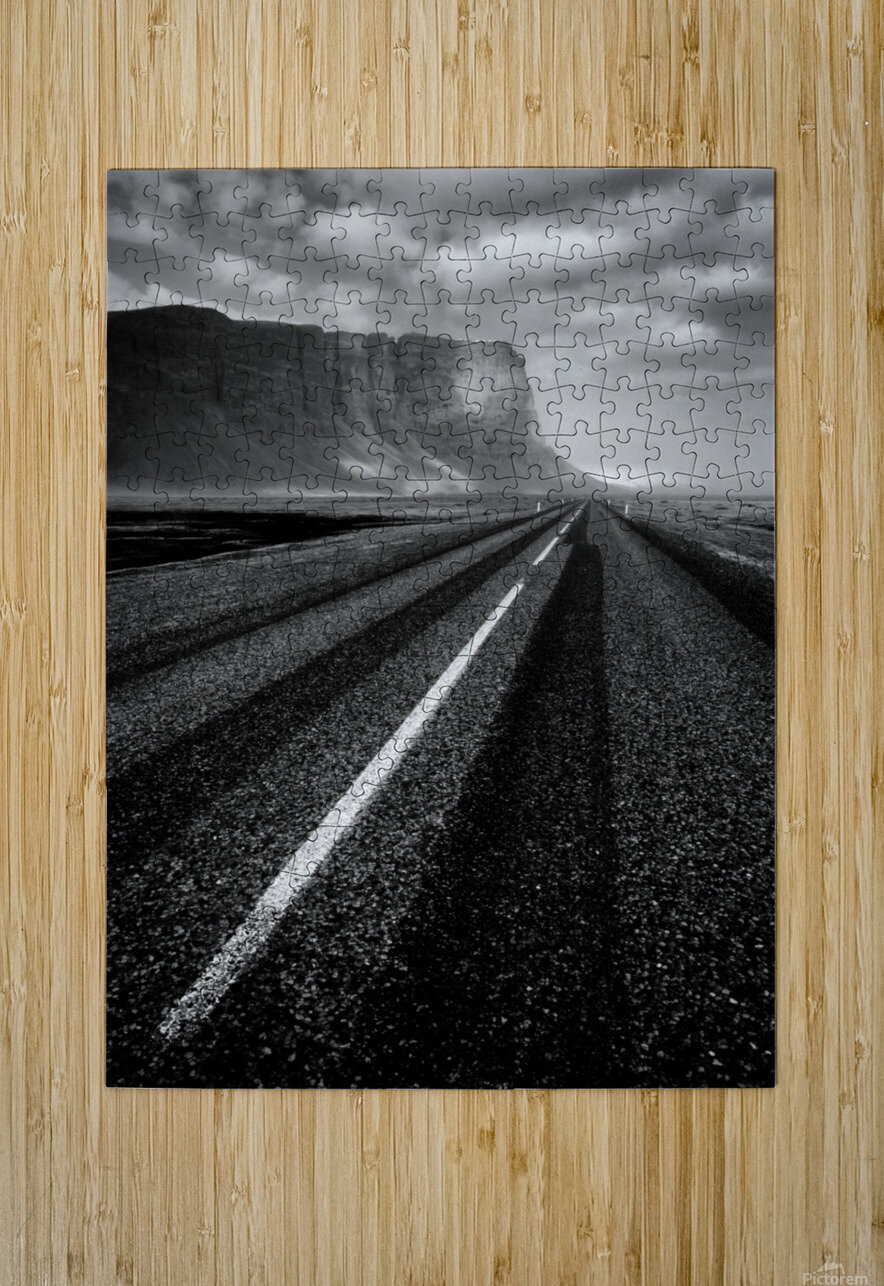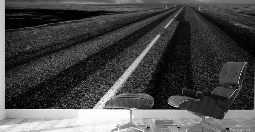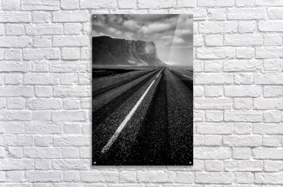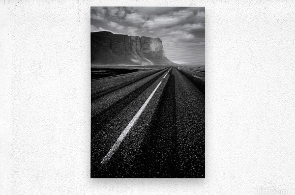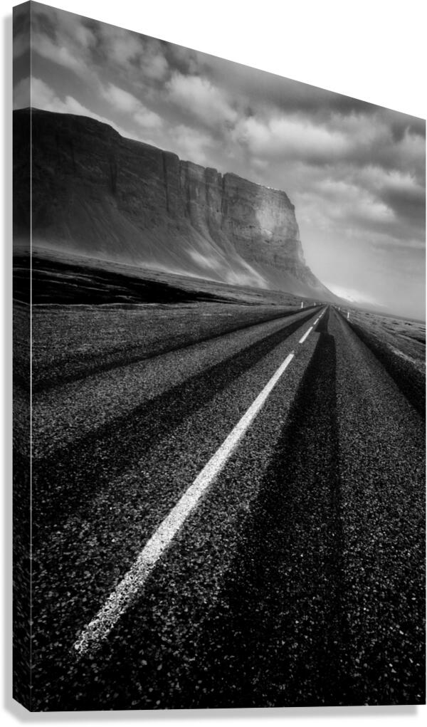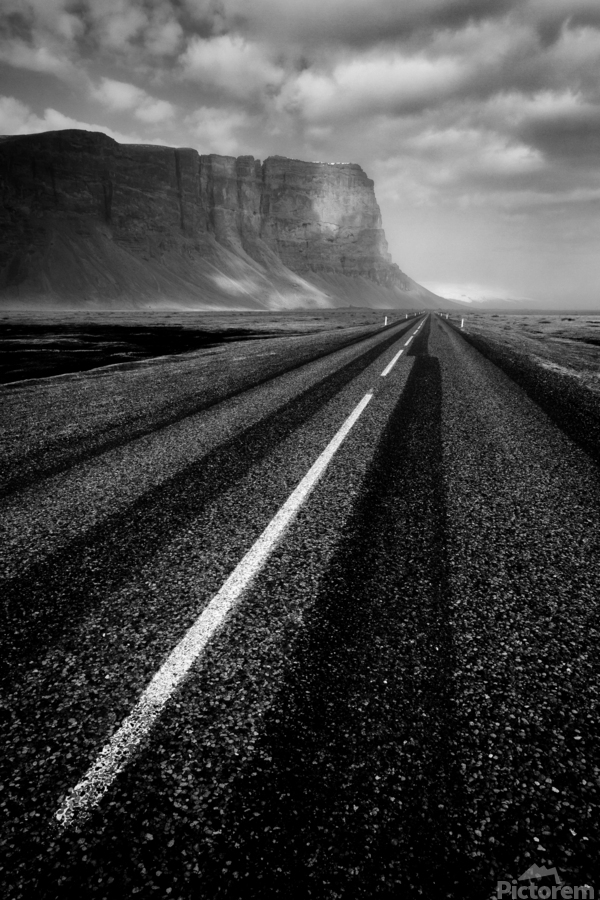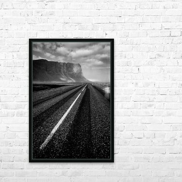 A quiet, deserted road stretches through the stark landscape of southern Iceland, its white lines drawing the eye toward a looming cliff face in the distance. The heavy clouds overhead add weight to the scene, enhancing the sense of isolation and vastness. A great photograph for those who connect with solitude, open space, and the raw, untamed character of Iceland’s terrain.