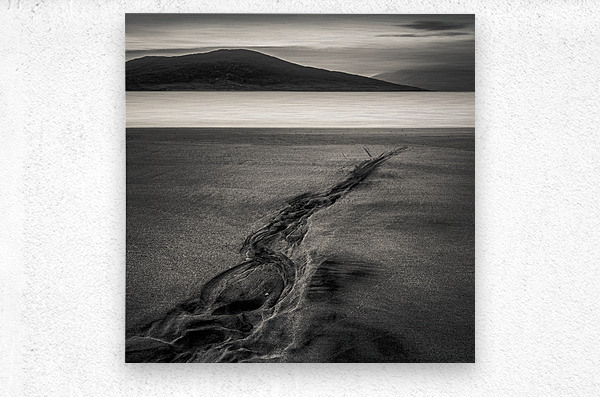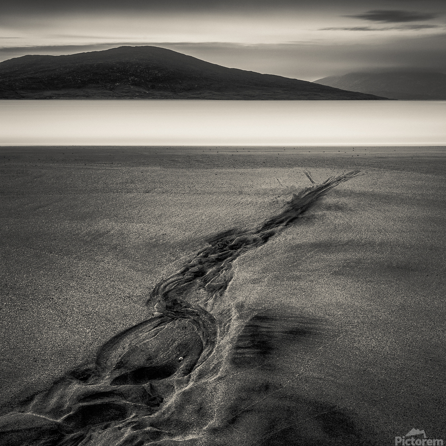 Sand tracks meander across Seilebost Beach on the Isle of Harris, Scotland, their patterns etched by a now-dry rivulet. The tracks lead toward the calm sea, where the distant Isle of Taransay appears as a dark silhouette against a softly lit sky. A great photograph for those who appreciate the quiet elegance of Scotland’s coastal landscapes.