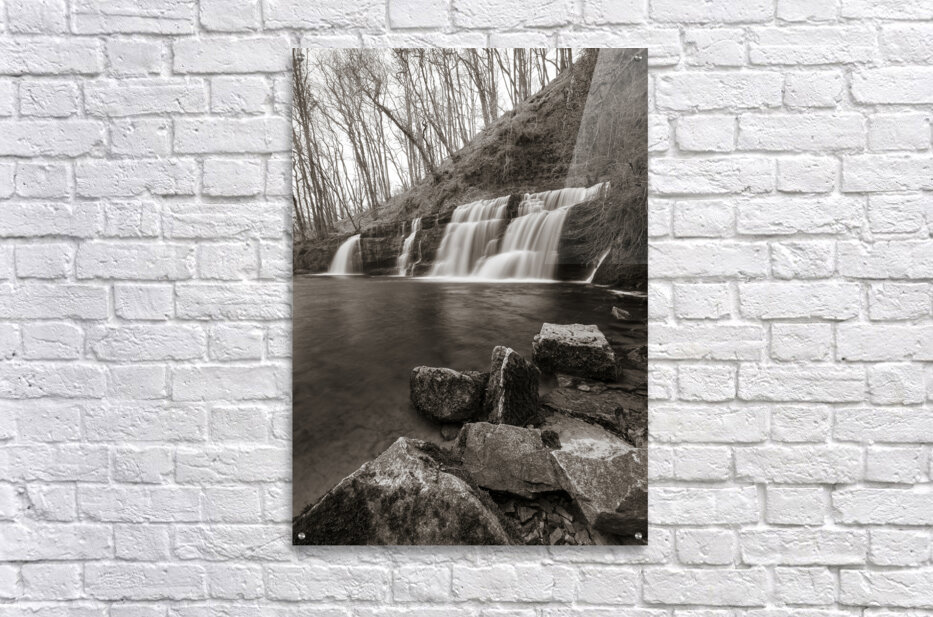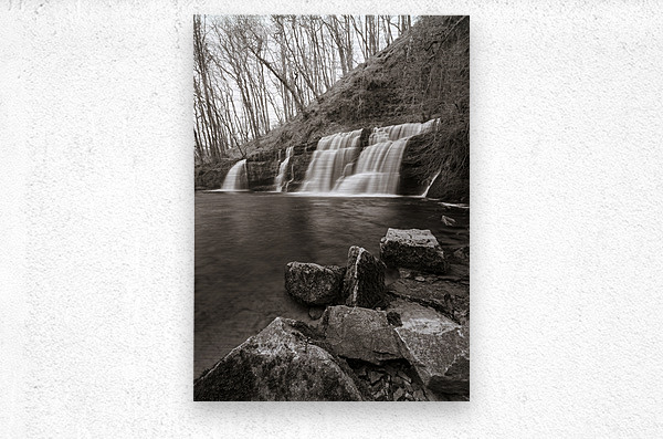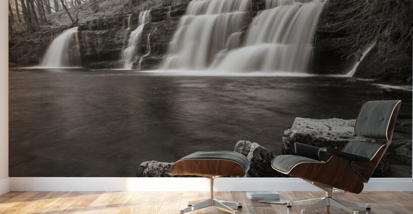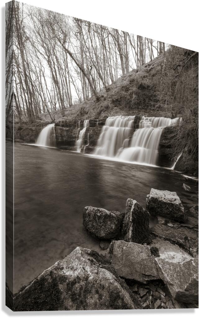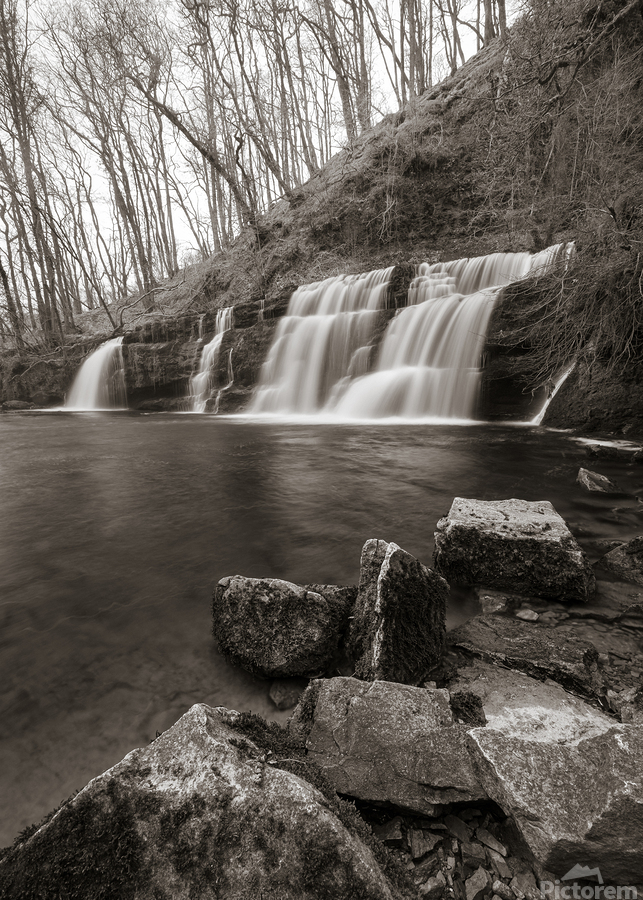 A warm-toned monochrome long exposure photograph captures the serene beauty of Sgwd Yr Pannwr waterfall as it gracefully tumbles over a rugged rocky l...[+]