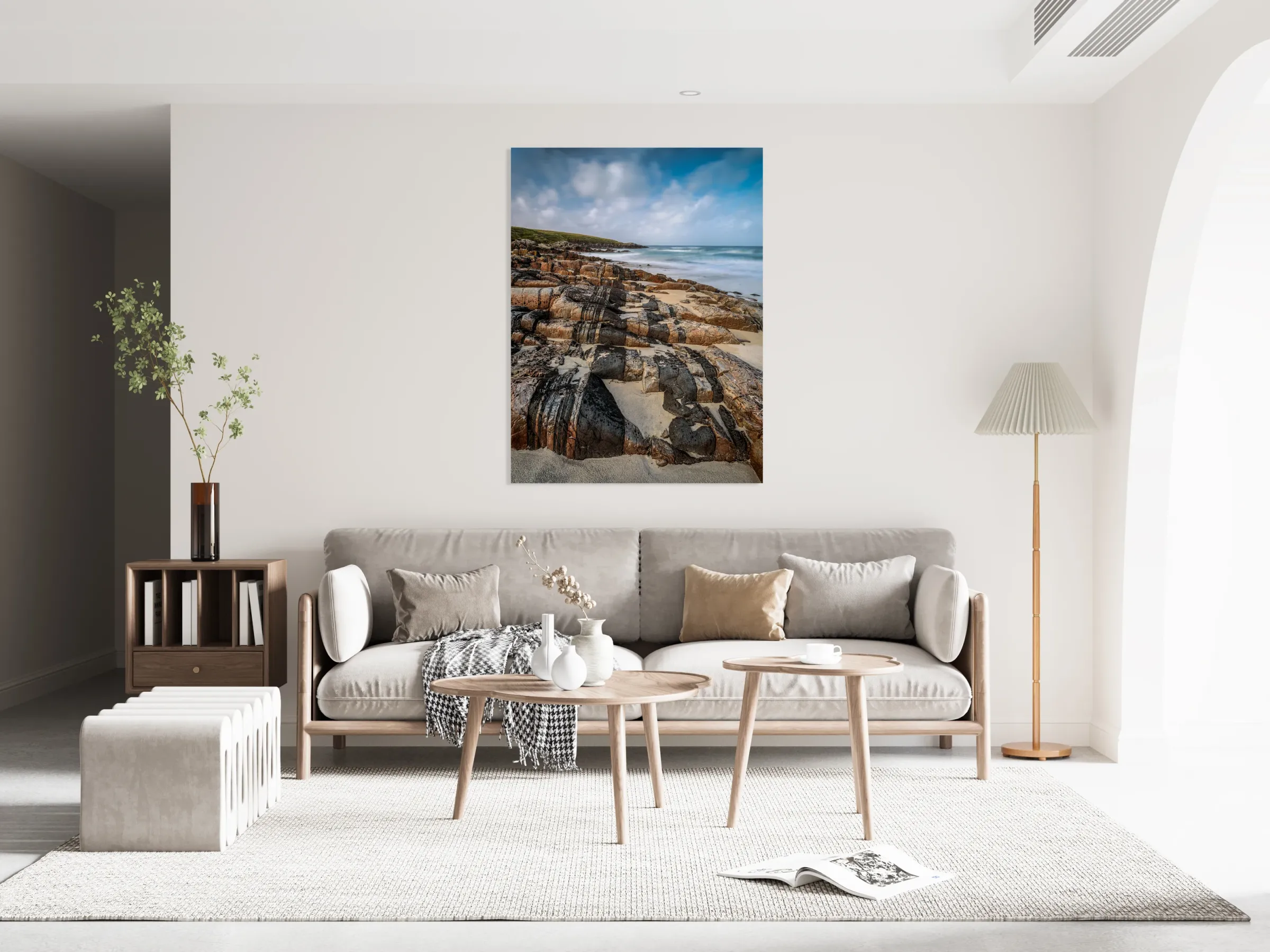 A photograph of the unusual striped rock formations on Hosta Beach also known as Traigh-stir on North Uist in the Outer Hebrides Scotland. This image captures the unique geological patterns and the natural beauty of the coastal landscape. The striped rocks shaped by centuries of natural processes create a striking visual contrast against the sandy shore and the surrounding scenery. Ideal for those interested in geology natural wonders and the rugged landscapes of the Scottish islands. This photograph showcases one of the distinctive features of North Uist’s coastline making it a perfect addition to any collection focused on the Outer Hebrides or Scottish coastal landscapes.