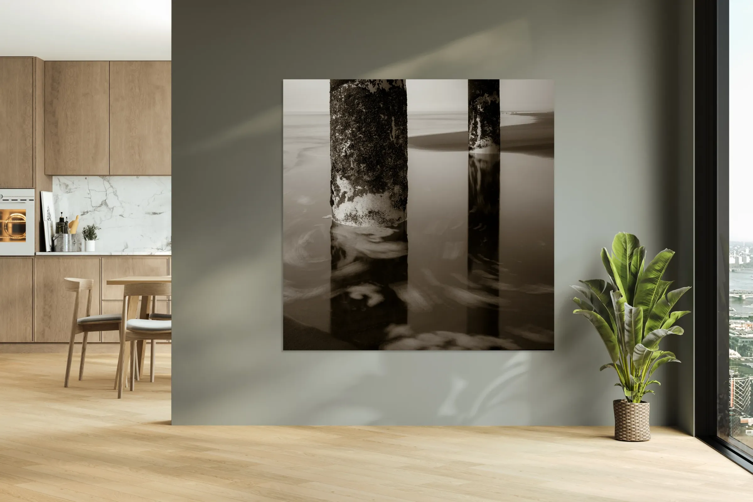 A semi-abstract monochrome photograph capturing the supporting pillars beneath Scheveningen Pier in the Netherlands with sea foam swirling around them. This artistic image highlights the intricate structure of the piers columns and the dynamic movement of the oceans surf creating a striking contrast between the solid pillars and the fluid sea. Ideal for those seeking unique coastal-themed art that emphasizes the interplay between man-made and natural elements.