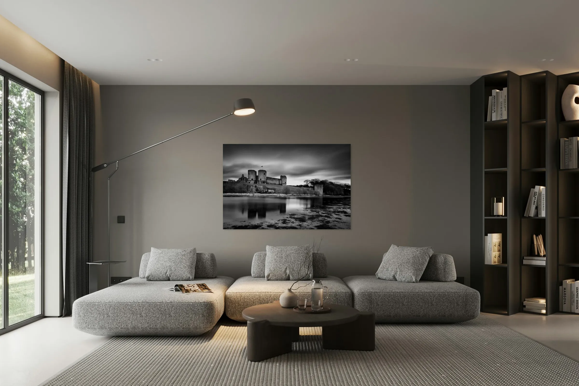 A monochrome long exposure photograph of the ancient and medieval ruins of Rhuddlan Castle reflected in the serene waters of the River Clwyd in Rhuddlan North Wales. This image highlights the historic architecture and tranquil ambiance of Rhuddlan Castle a significant landmark with centuries of history. Perfect for those interested in historic sites medieval architecture and scenic landscapes this photograph offers a timeless view of one of North Wales most iconic castles.