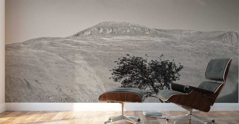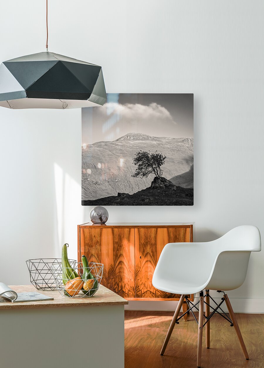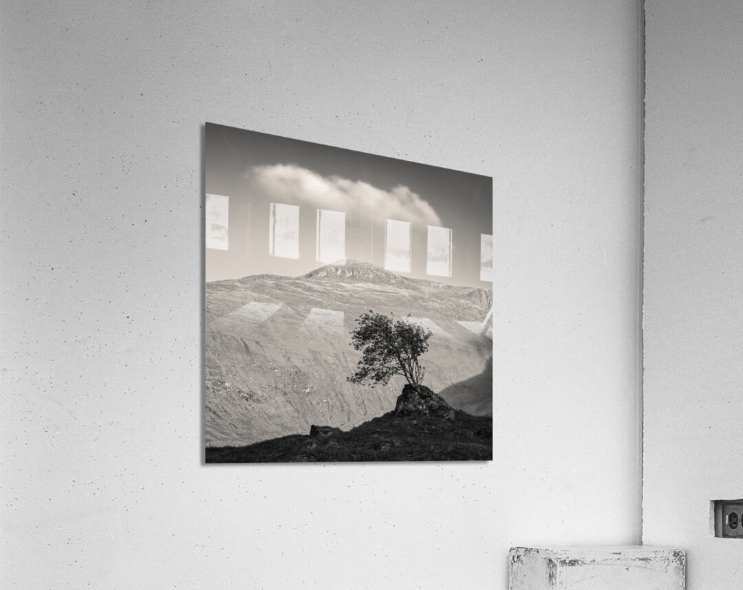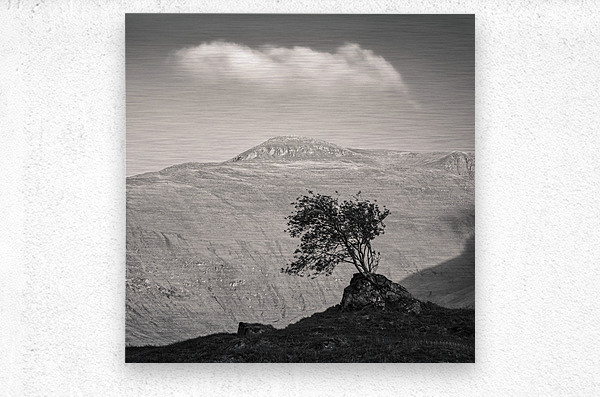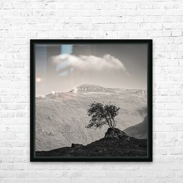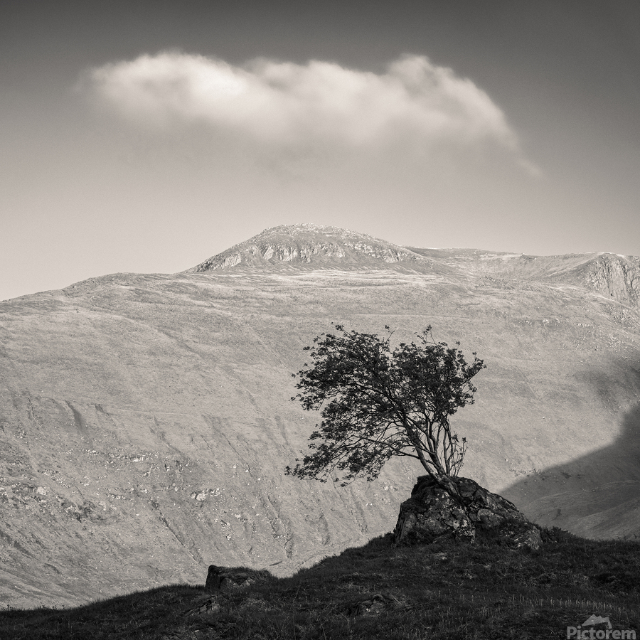 A monochrome warm-toned photograph capturing a solitary Highland tree silhouetted against the setting sun on the mountainous terrain of Glen Shiel in ...[+]