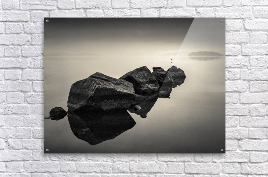 Loch Lomond feels hushed and self-contained in this calm Scottish morning, with the water holding everything in a state of near stillness. The presence of the rocks gives the scene weight and quiet authority, while a single bird skims low across the surface of the loch, introducing a subtle sense of life without breaking the calm. The mood is restrained and contemplative, drawing its strength from balance rather than drama. Loch Lomond is one of Scotland’s most iconic freshwater lochs, long associated with solitude, reflection, and expansive landscapes. On calm mornings like this, the water can become almost mirror-like, softening the boundary between land and sky. The rocks anchor the scene physically and visually, while the distant mist hints at depth and scale without overwhelming the composition. A perfect photograph for those drawn to minimalist landscapes, quiet Scottish scenery, or images that emphasise balance, calm, and restraint. This image is available as wall art and across a wide range of formats to suit your space or style. ..... Please note: This image has a grainy texture which is both intentional and because it was photographed on analog film.