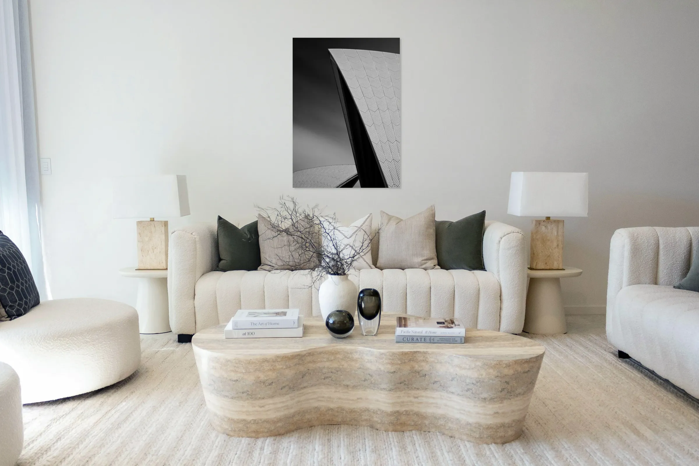 A monochrome semi-abstract photograph of the Sydney Opera House in Sydney Australia. This image captures the iconic roof design highlighting its unique architectural elements. Ideal for architecture enthusiasts art collectors and interior decor.