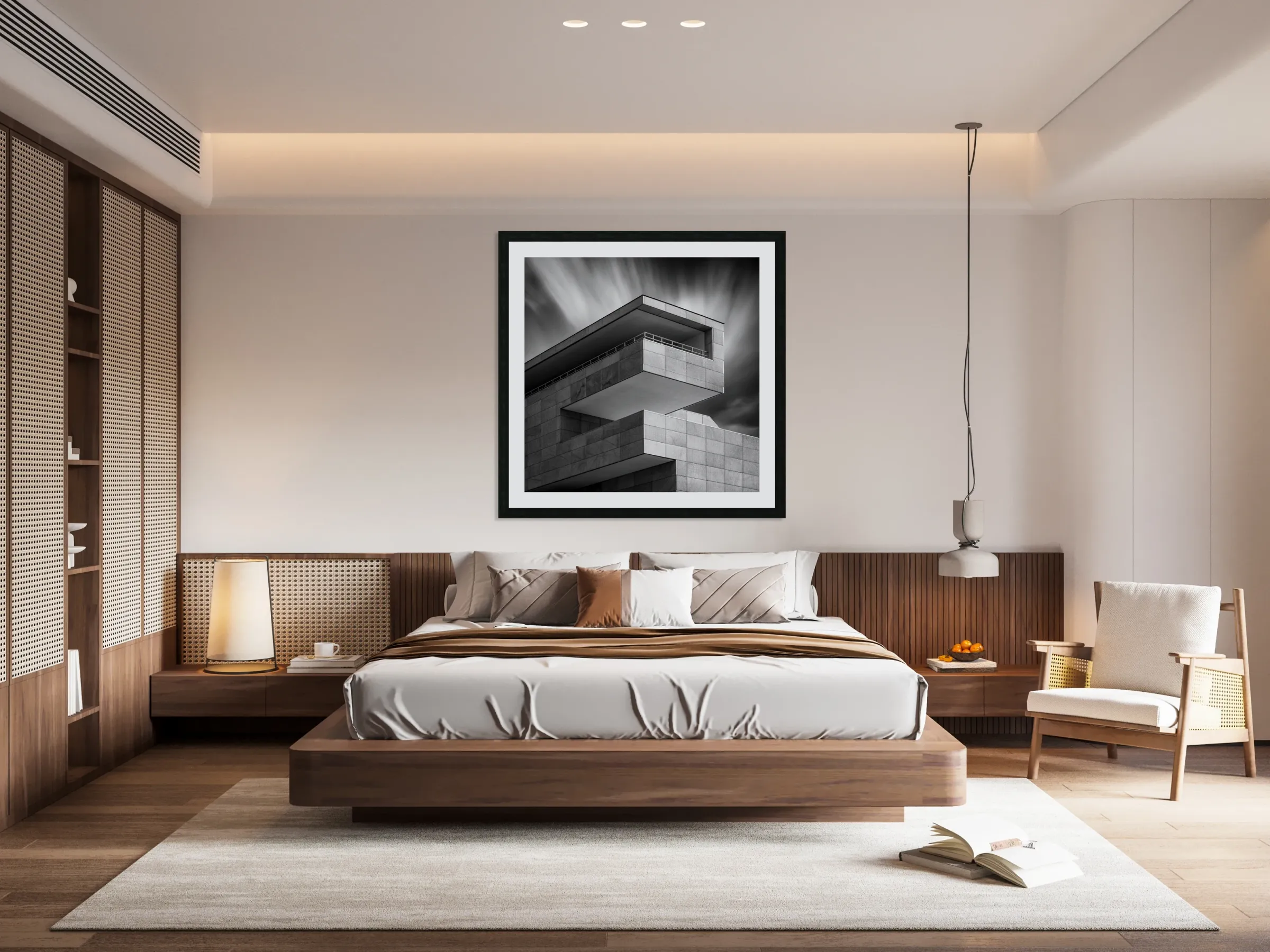 A monochrome long exposure photograph capturing the architectural study of a modern Dutch building in Rotterdam Netherlands. This striking image showcases the intricate design reminiscent of an Escher drawing highlighting the complex geometry and unique structure of the building. The black and white composition and long exposure technique enhance the depth and visual appeal of the architectural details. Perfect for architecture enthusiasts art collectors and those with an appreciation for modern design.