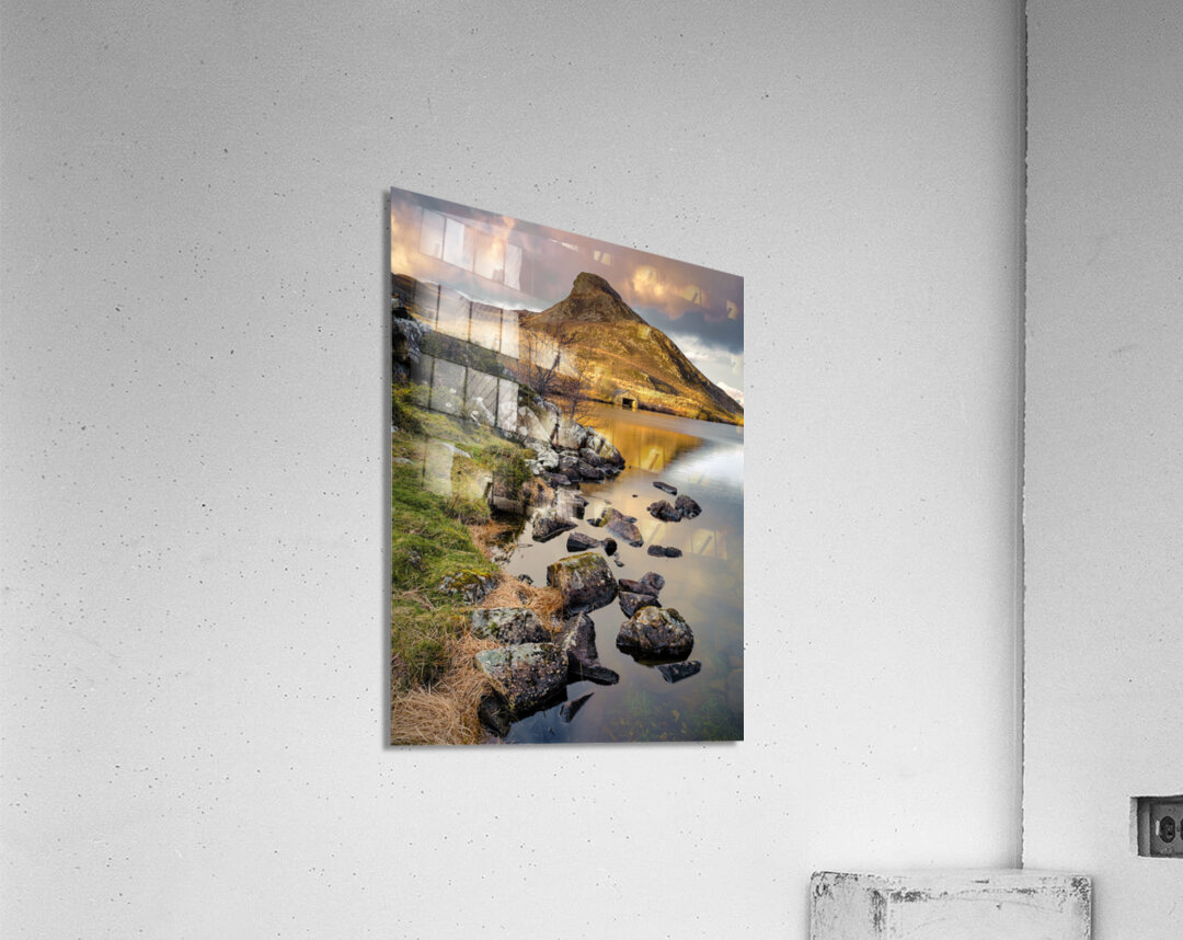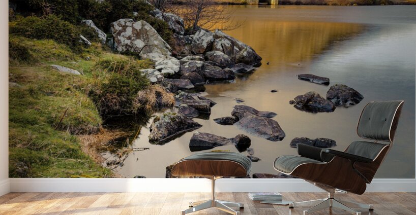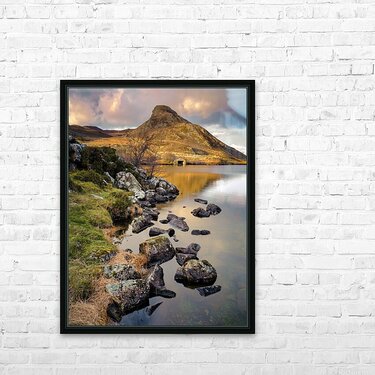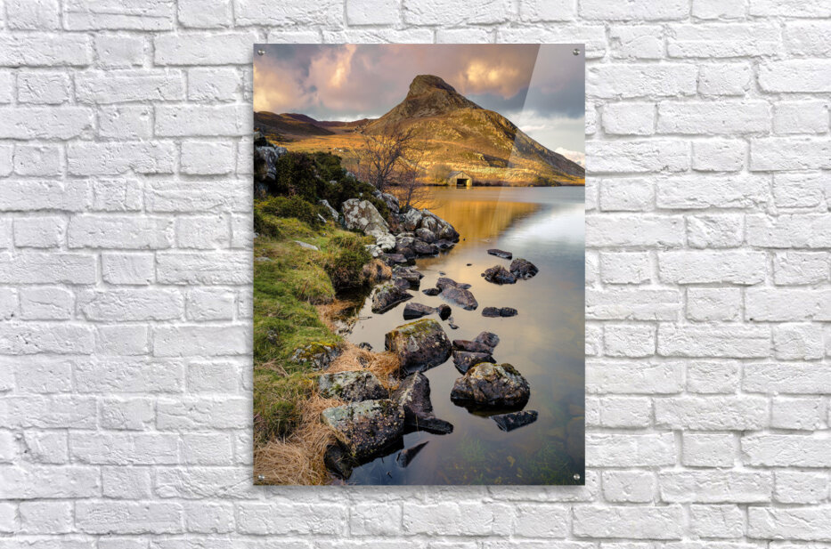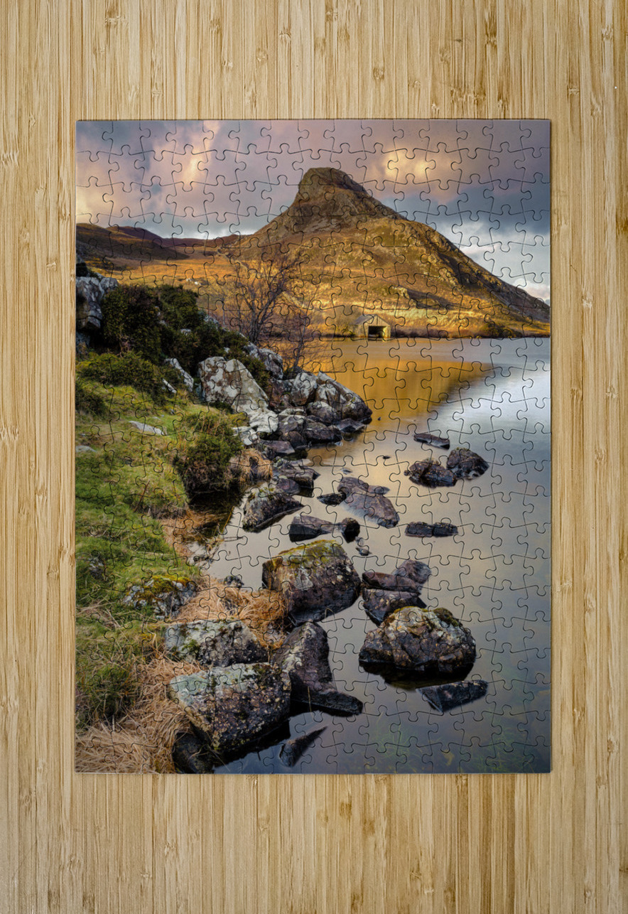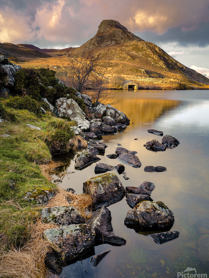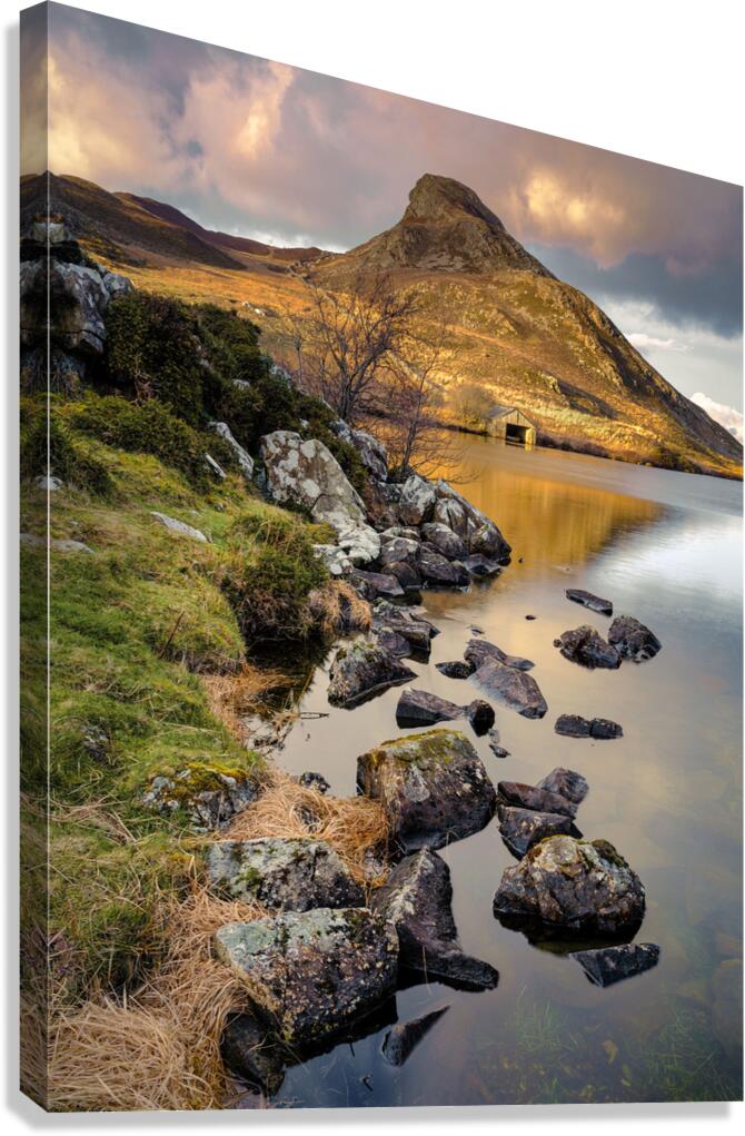 A serene early morning Spring view of Cregennen Lake in Gwynedd Wales featuring a rustic wooden boathouse bathed in sunlight in the distance. The boathouse sits on the shores of the lake at the foot of a small mountain capturing the tranquil essence of the Welsh countryside. Ideal for nature enthusiasts landscape photography collectors or anyone who appreciates the beauty of Wales.