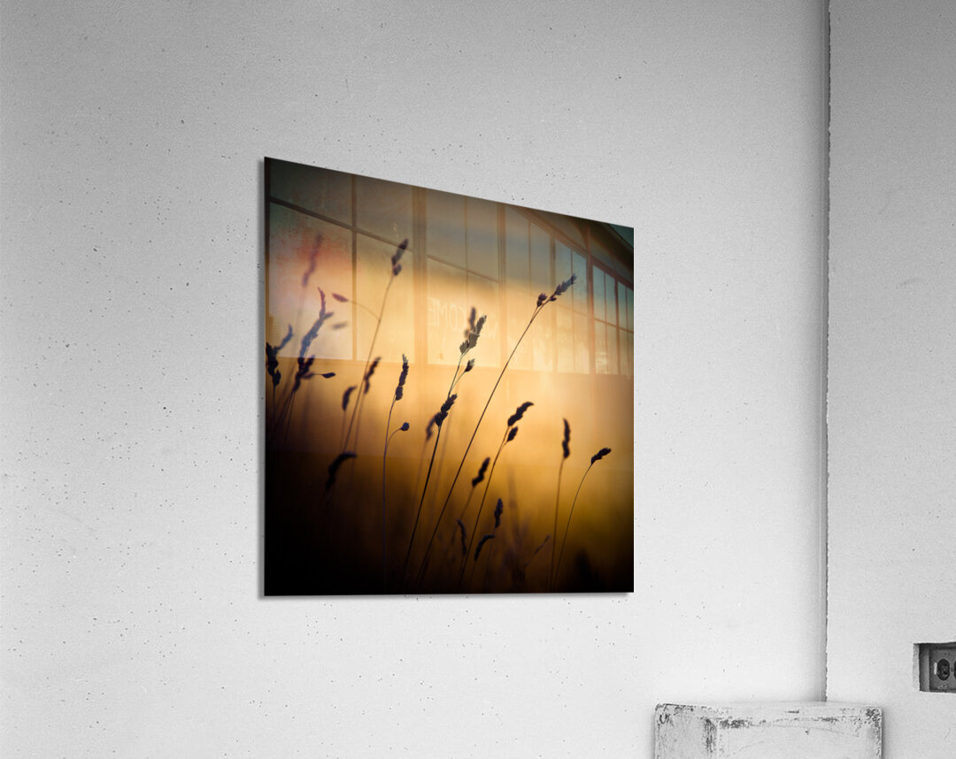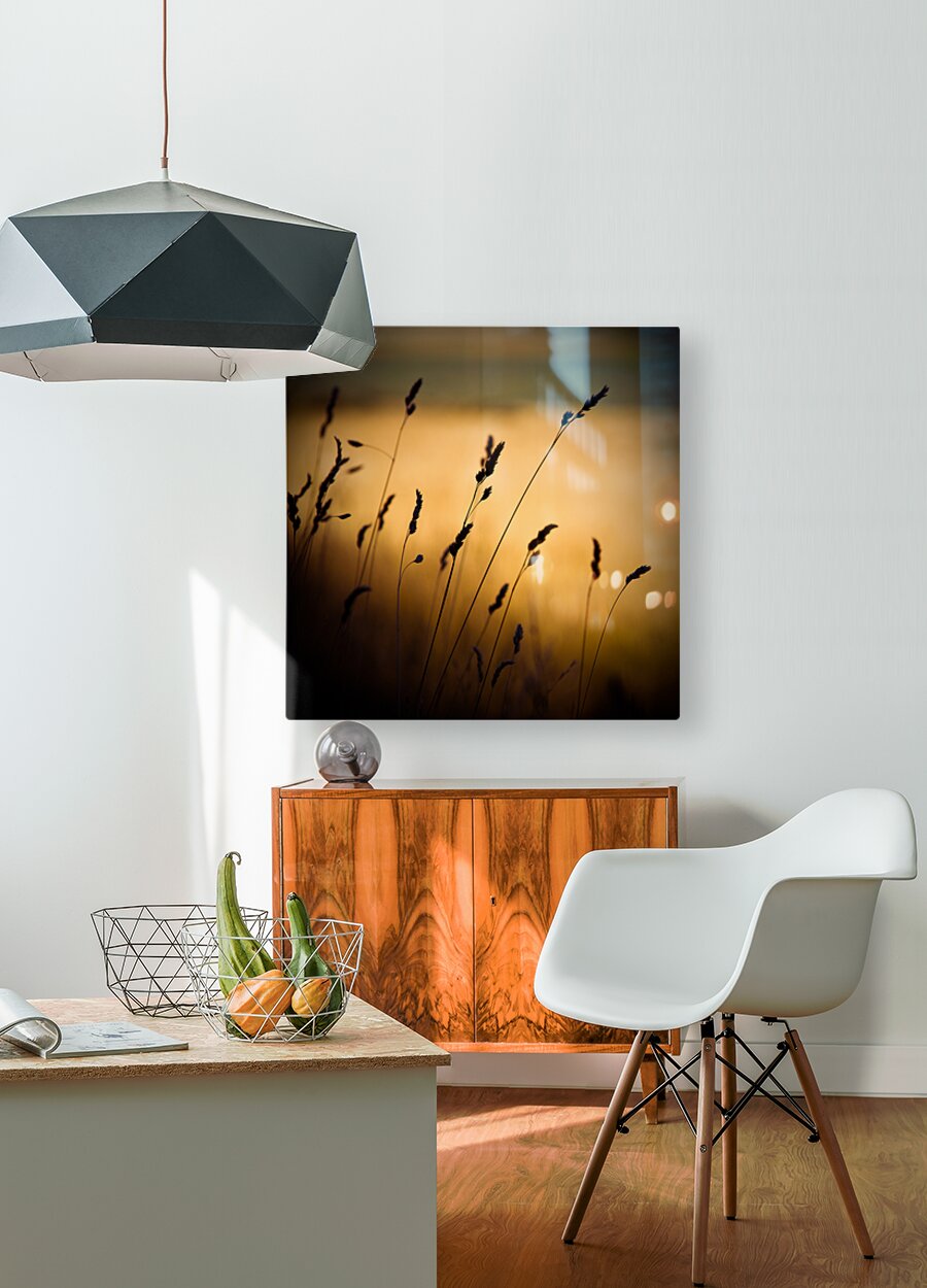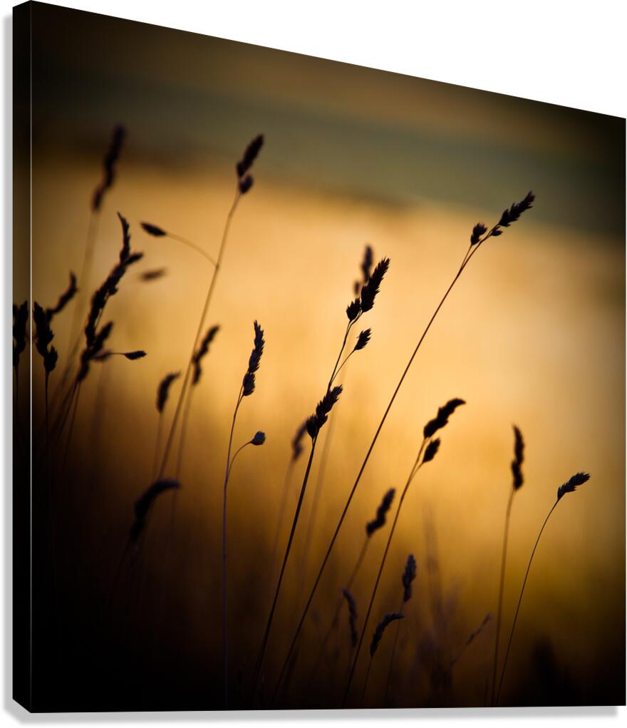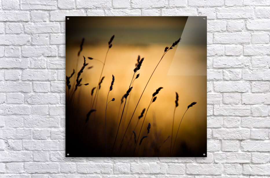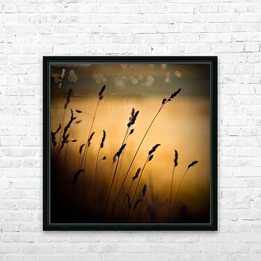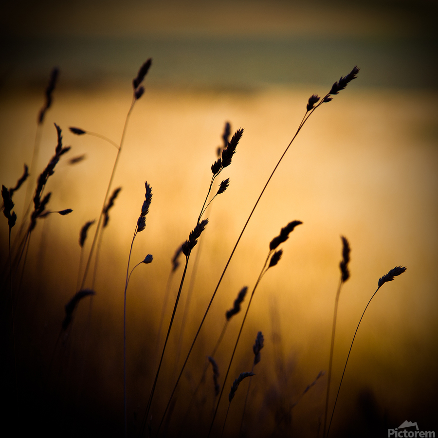 A minimalist image of grass silhouetted at sunset in a New Zealand field. This photograph captures the warm and nostalgic ambiance of a serene evening with rich golden hues. The simple yet striking composition highlights the natural beauty and tranquility of the New Zealand landscape. Ideal for creating a calming and evocative atmosphere in any space.