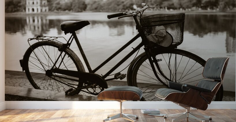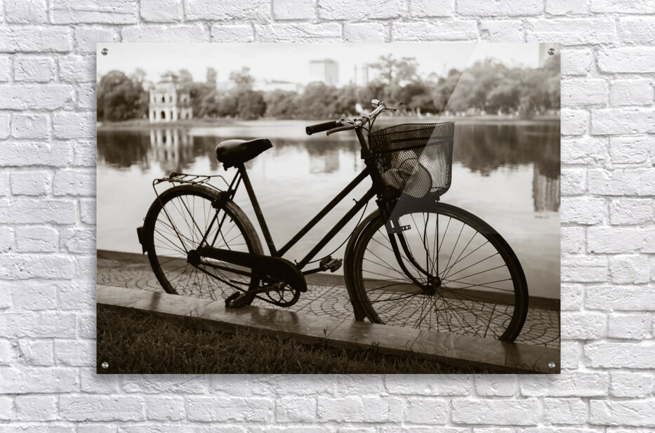 A monochrome photograph of a vintage bicycle parked by the edge of Kiem Lake in Hanoi Vietnam. The image captures the nostalgic essence of a classic s...[+]