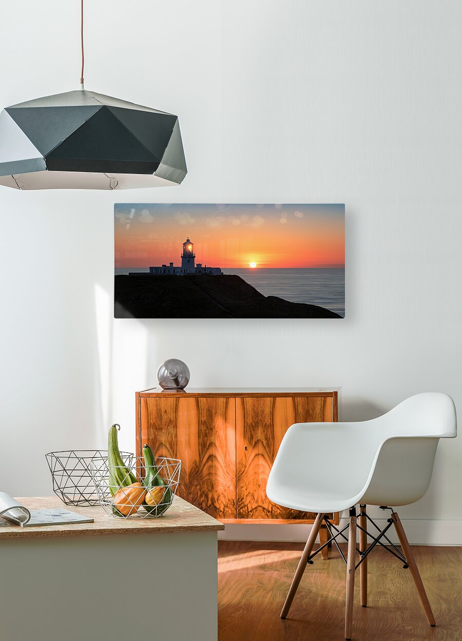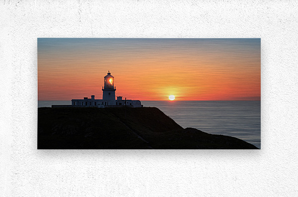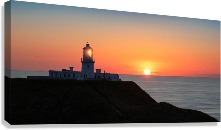 A panoramic view of Strumble Head at sunset featuring the lighthouse silhouetted against a vivid orange sky with the setting sun. The lighthouse light is visible adding a striking element to the scene. Ideal for landscape photography enthusiasts and coastal decor.