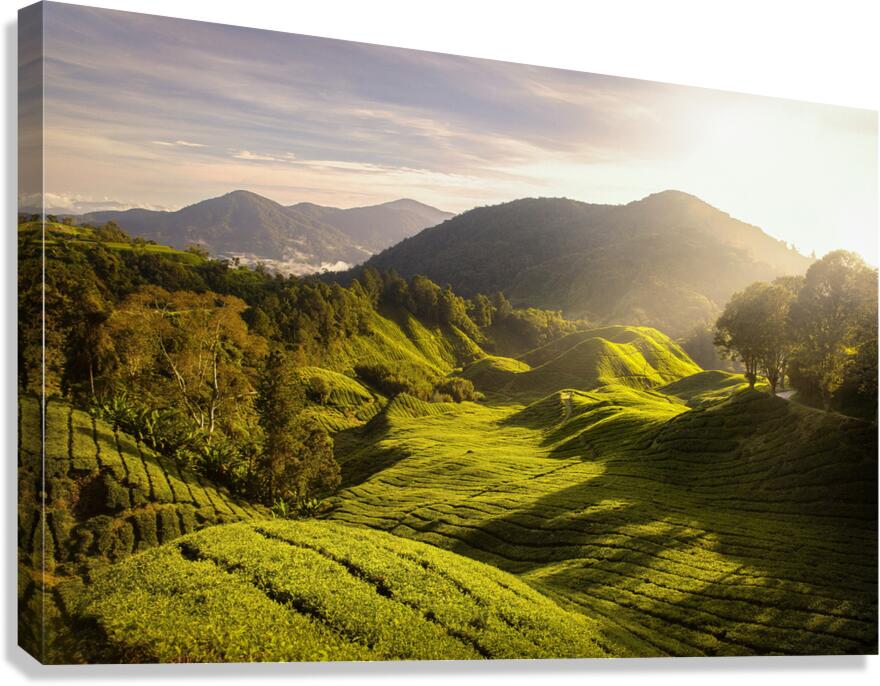 A serene early morning sunrise casts a warm glow over the lush tea plantations of Cameron Highlands Malaysia. This captivating photograph captures the rolling green hills with delicate sunlight filtering through the trees highlighting the intricate patterns of the tea fields. The tranquil scene embodies the natural beauty and serene atmosphere of this renowned highland region. Ideal for enhancing nature-themed decor or travel-inspired collections.