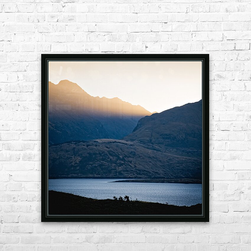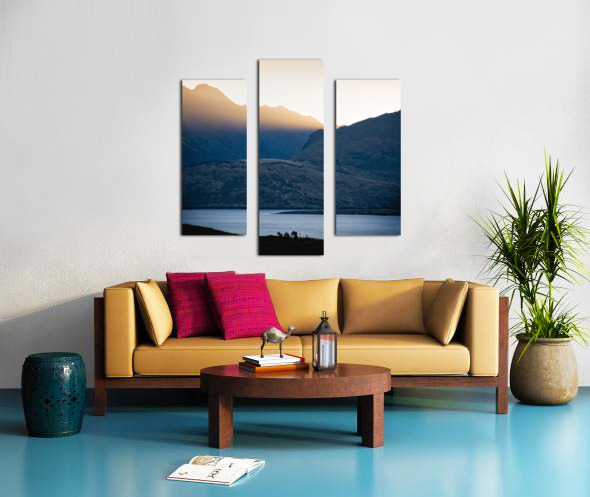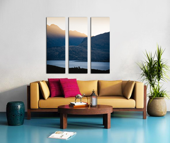 A tranquil sunset over a serene lake in New Zealands South Island. The warm rays of the setting sun gently illuminate the mountain peaks while the lake below remains in a cool blue shade. This minimalist scene captures the peaceful contrast between light and shadow. Perfect for nature lovers and minimalist art enthusiasts looking to bring a touch of natural beauty into their space.
