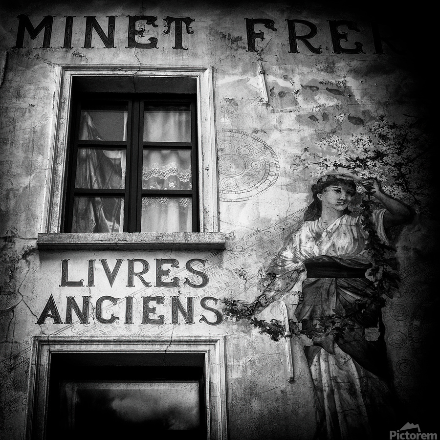A monochrome photograph of the exterior of a vintage book shop in Brussels Belgium. The image captures the rustic charm of the scene with prominent le...[+]