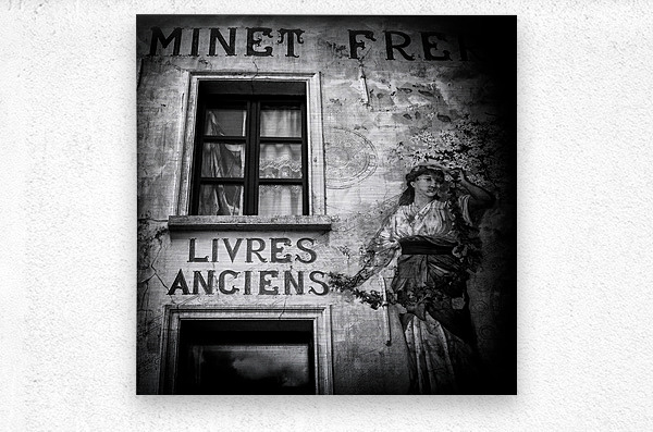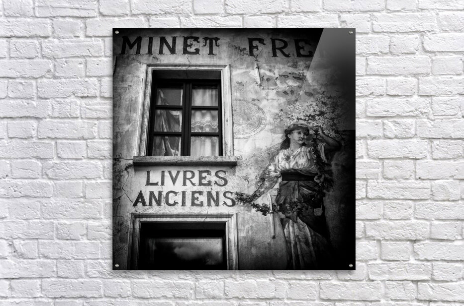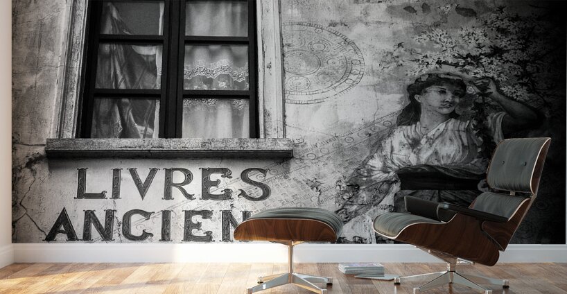 A monochrome photograph of the exterior of a vintage book shop in Brussels Belgium. The image captures the rustic charm of the scene with prominent lettering on the wall and the shop window. A vintage painting of a woman adorns the wall adding to the timeless atmosphere. Perfect for lovers of vintage aesthetics European architecture and classical art themes.
