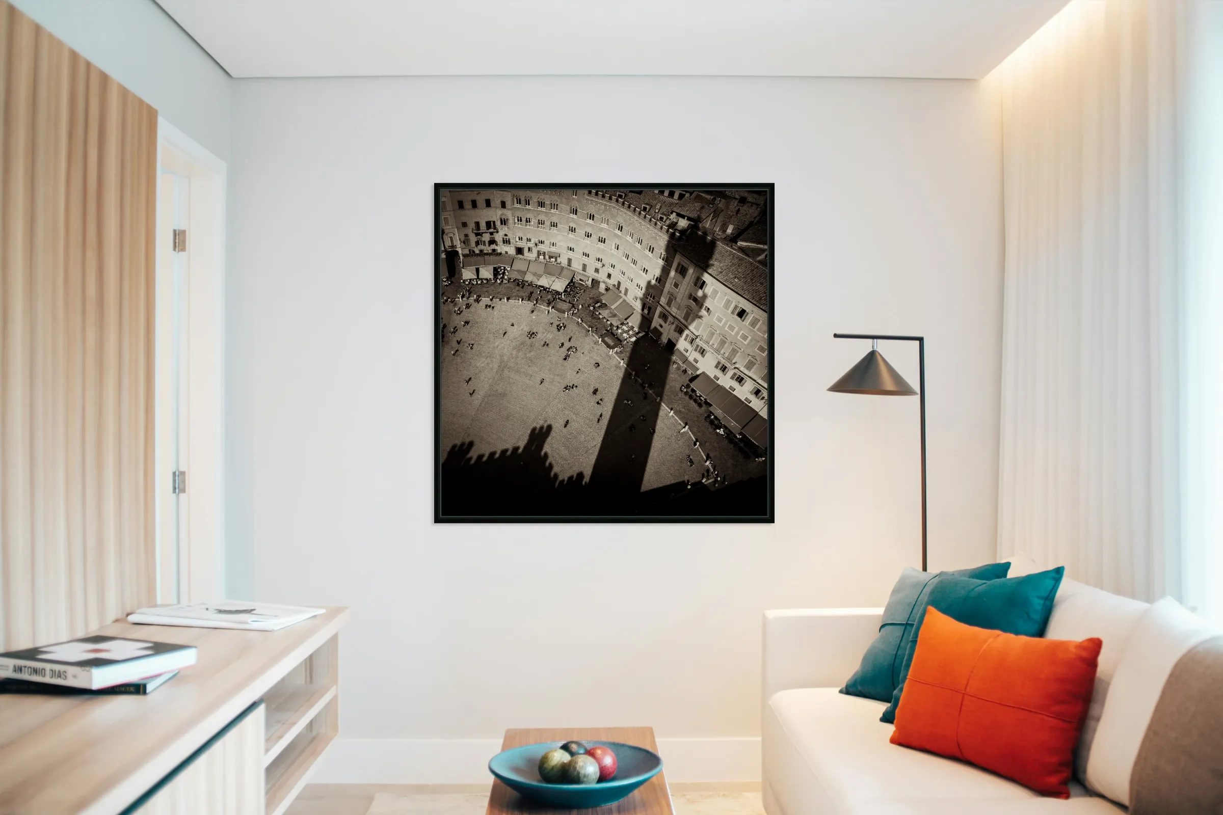 A monochrome sepia-toned photograph of the famous Piazza del Campo in Siena Italy captured from an elevated perspective. This image prominently features the shadow of the Torre del Mangia cast over the historic square highlighting the architectural details and layout of this renowned landmark. Ideal for enhancing historical or travel-themed decor this photograph offers a timeless view of one of Italys most iconic locations.