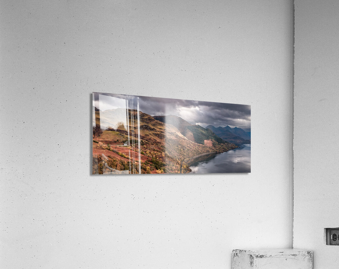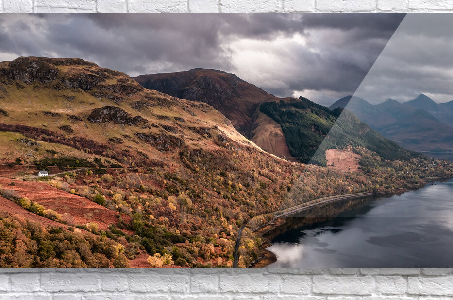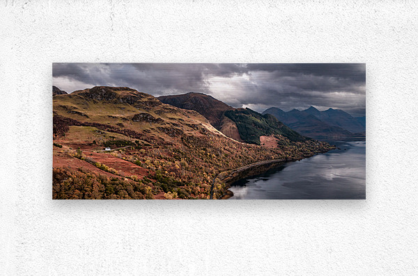 A panoramic photograph of a small white house perched above Loch Duich in the Scottish Highlands Scotland. The scene features a remote diminutive house set against a dramatic landscape with heavy overcast skies looming overhead. The contrast between the house and the expansive rugged terrain emphasizes the solitude of this picturesque location. Ideal for adding a touch of serene remote Scottish beauty to any collection.
