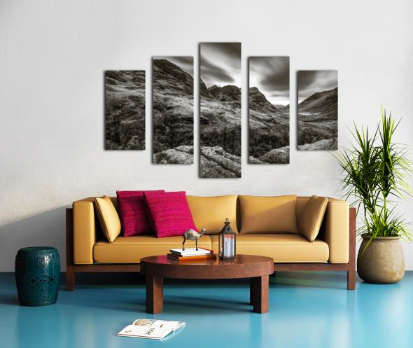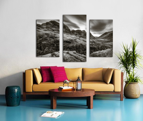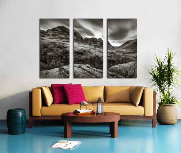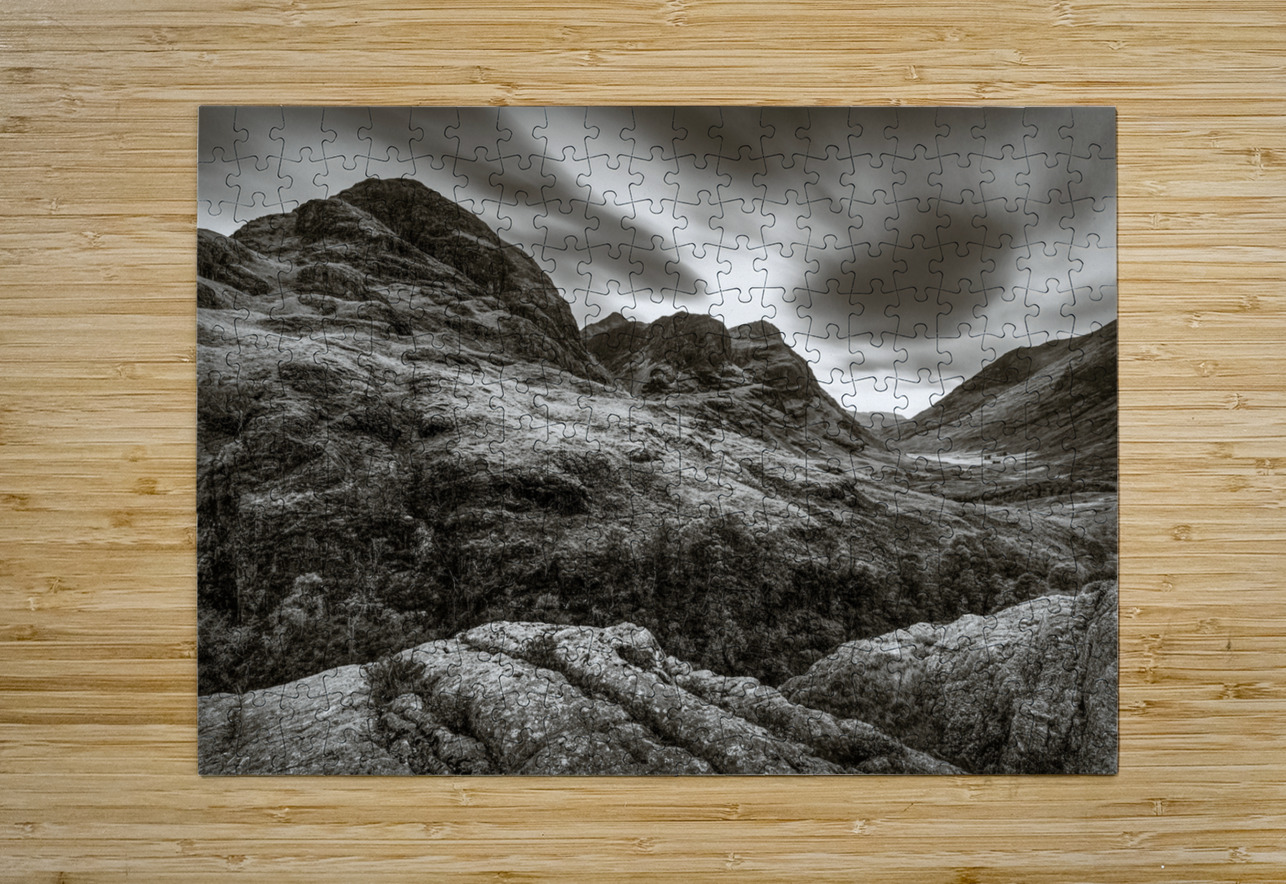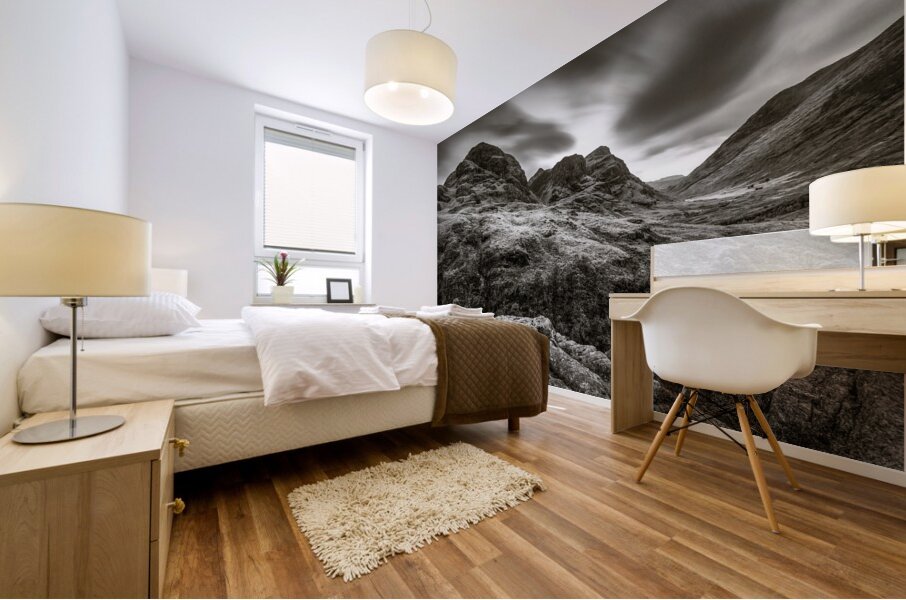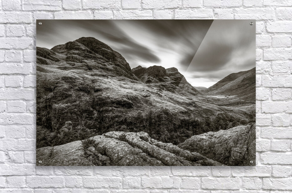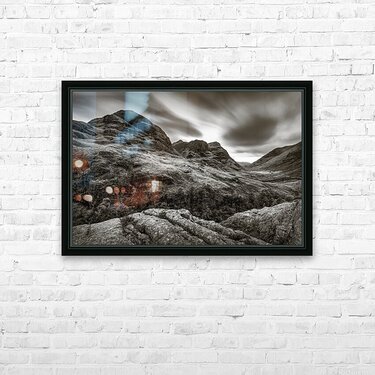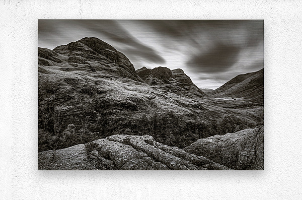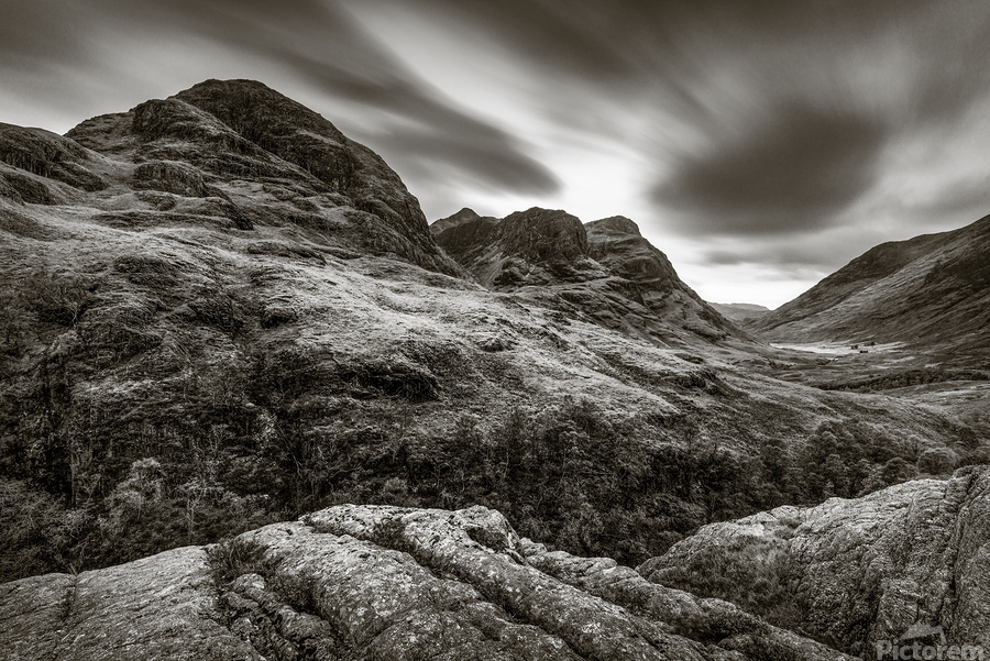A monochrome long exposure photograph capturing The Three Sisters mountain range in Glencoe Scotland with dynamic cloud movement overhead. This striki...[+]