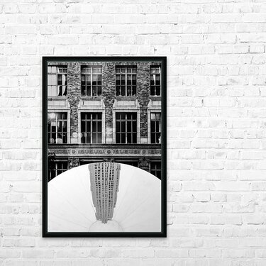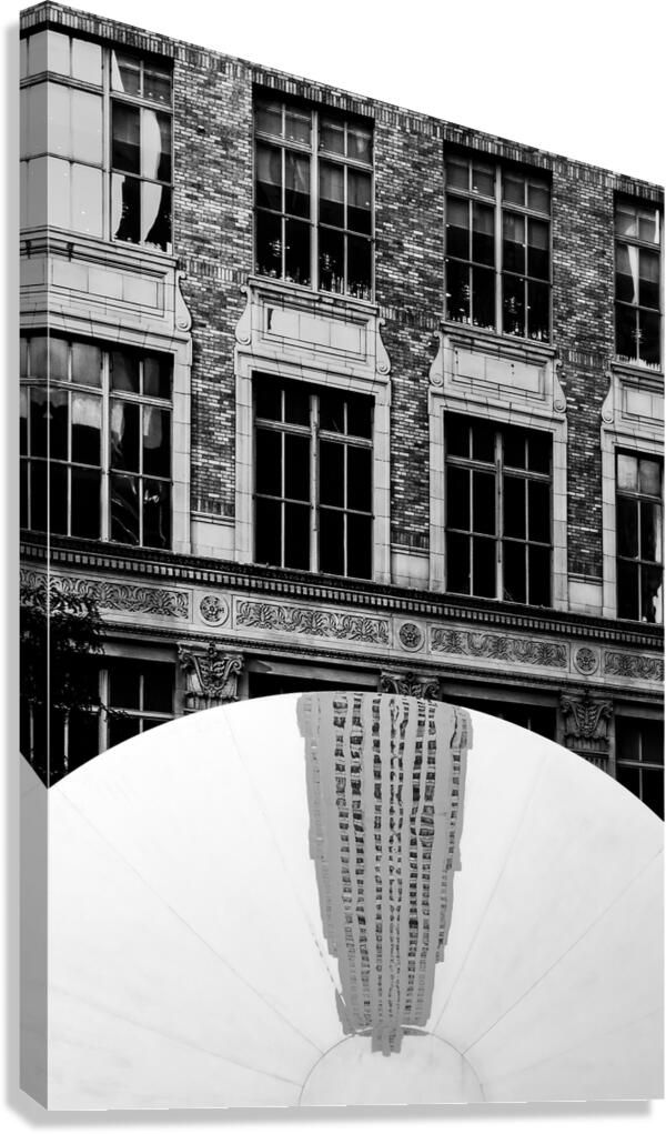 A monochrome photograph capturing Anish Kapoors Sky Mirror at its 2006 installation. This artwork standing nearly three stories tall was prominently displayed at the Fifth Avenue entrance to the Channel Gardens in New York. The image features the sculpture reflecting an inverted view of the Rockefeller Center creating a striking contrast against the surrounding cityscape. Ideal for those interested in contemporary art installations and urban landmarks.