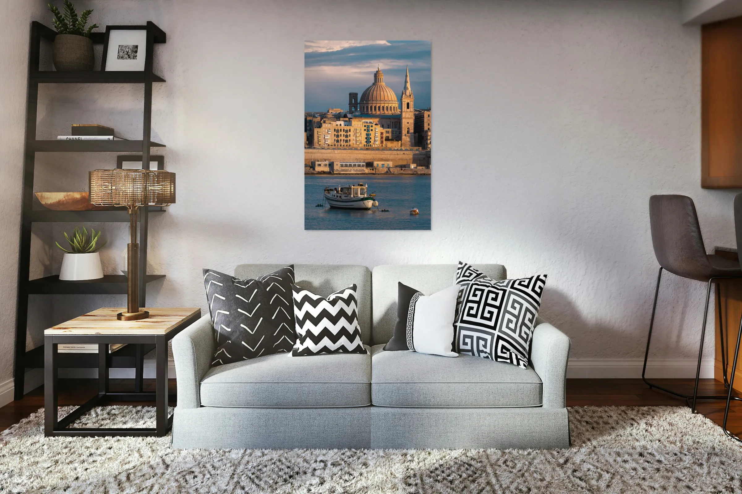A tranquil view of the waterfront in the historic old town of Valletta Malta captured in the gentle glow of the setting sun. This photograph highlights the iconic domed roof of the Basilica of Our Lady of Mount Carmel adding a touch of architectural beauty to the serene waterscape. This image perfectly showcases the unique charm and historical essence of Valletta at dusk. A great photograph for enhancing the ambiance of any home or office space.