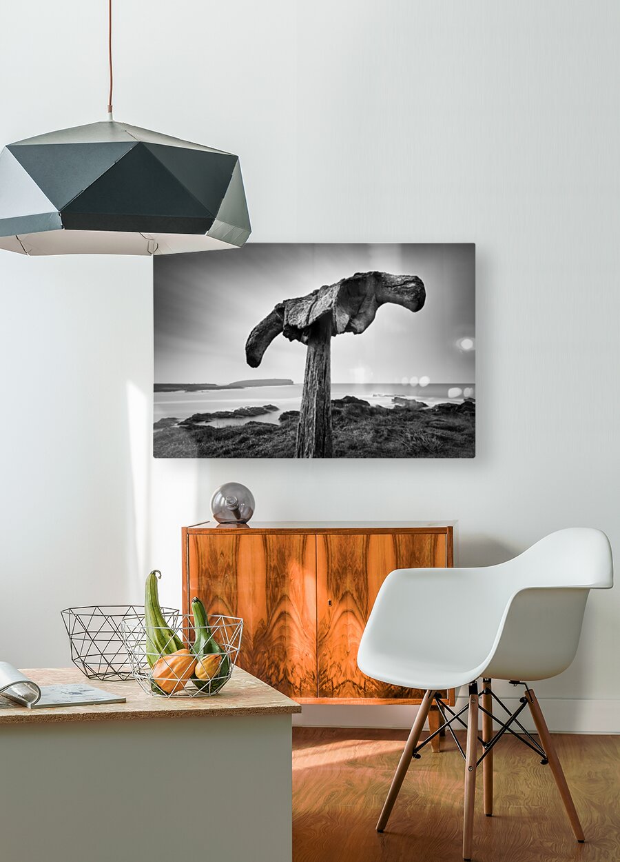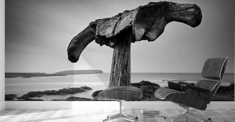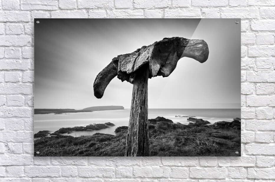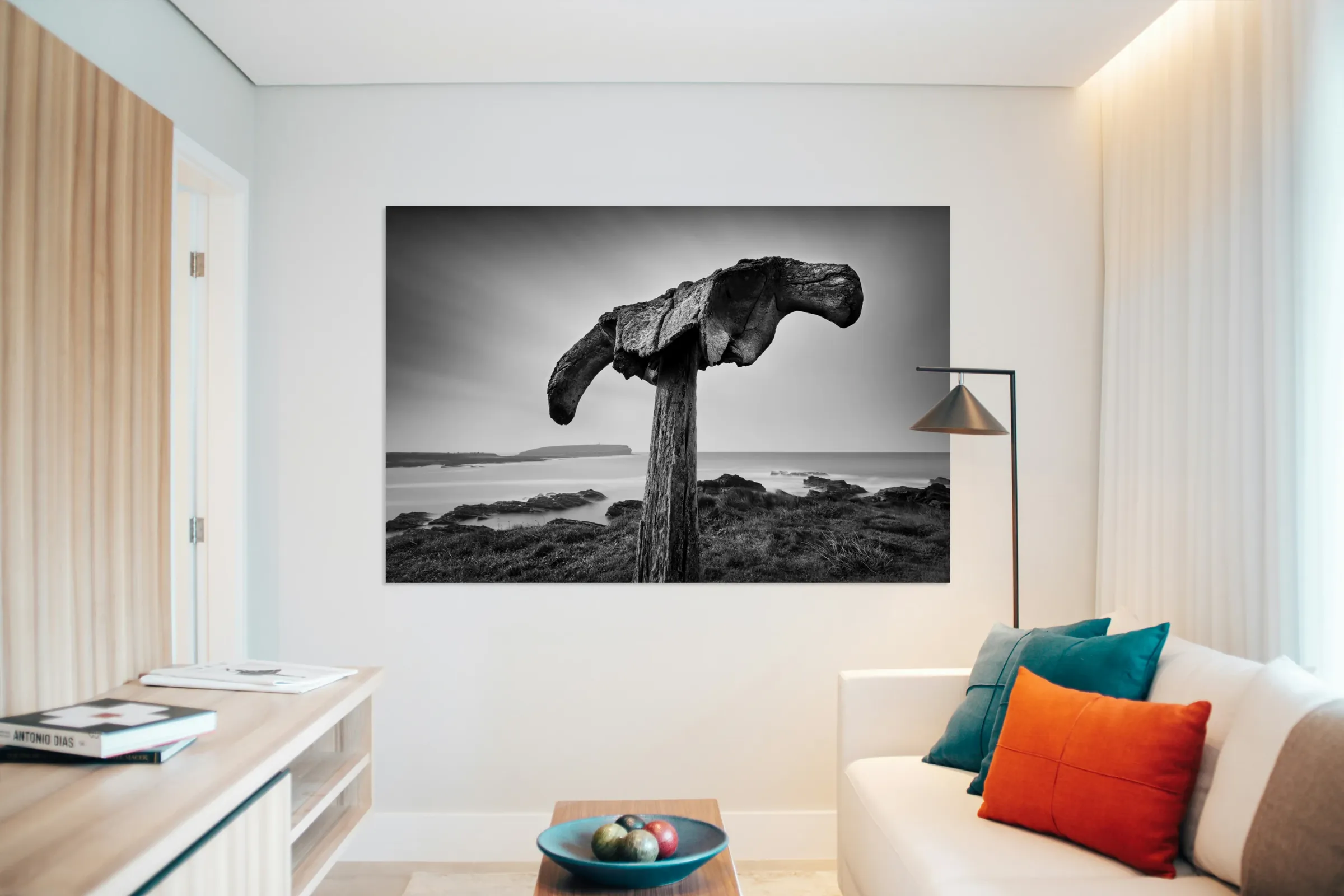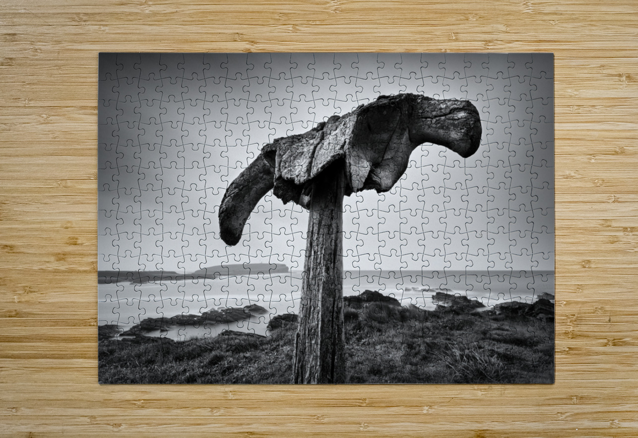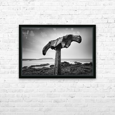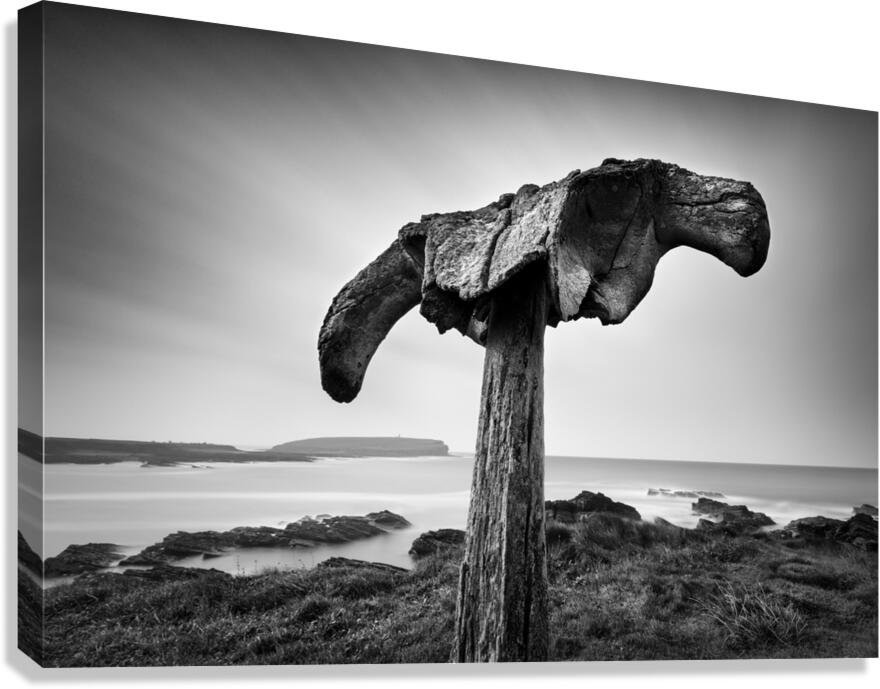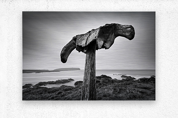 A monochrome photograph capturing an ancient whalebone mounted on a wooden pole at Skiba Geo Orkney Scotland. This historic artifact set against the rugged coastal landscape provides a striking representation of Orkneys maritime heritage. The black-and-white tones emphasize the texture and age of the whalebone offering a powerful visual connection to Scotlands past. A perfect photograph for collectors historians or anyone interested in Scottish history and coastal artifacts.
