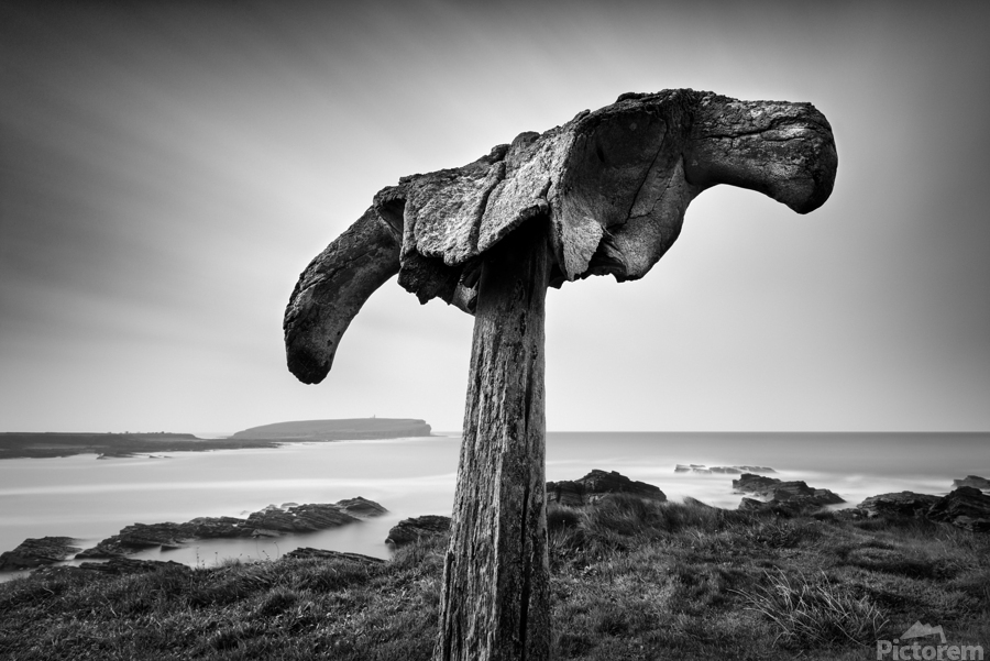 A monochrome photograph capturing an ancient whalebone mounted on a wooden pole at Skiba Geo Orkney Scotland. This historic artifact set against the r...[+]