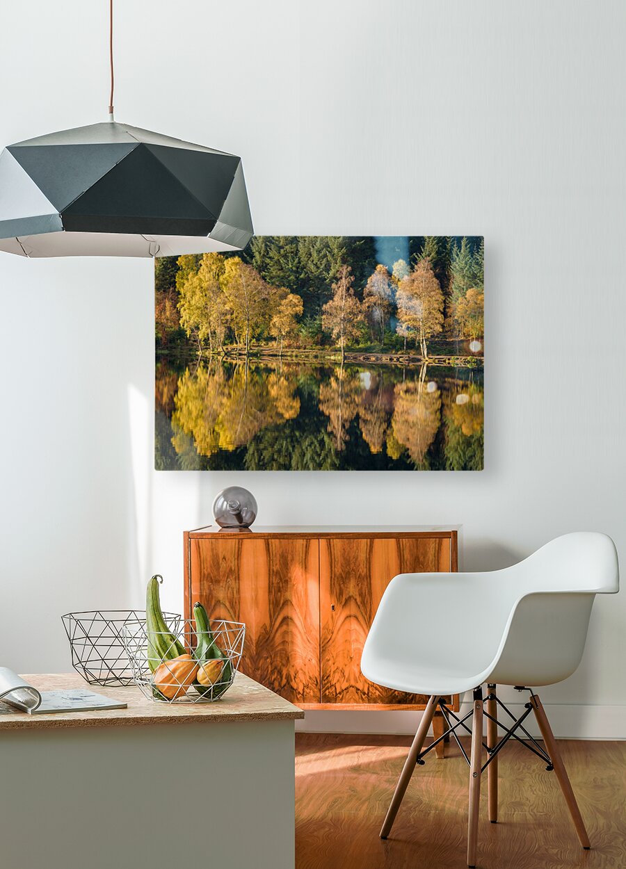A serene autumn landscape showcasing vibrant trees reflecting in the calm waters of Glencoe Lochan located in Glencoe Scotland. This photograph captures the rich fall colors of the foliage mirrored perfectly on the tranquil surface of the lochan highlighting the natural beauty of the Scottish Highlands. The peaceful setting and vivid reflections create a captivating scene of natures seasonal transition. A great photograph for nature enthusiasts landscape lovers and those seeking to add a touch of Scotlands scenic beauty to their collection.