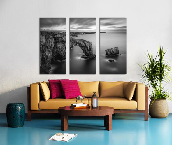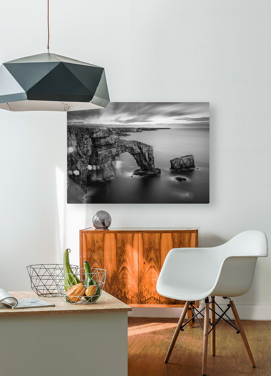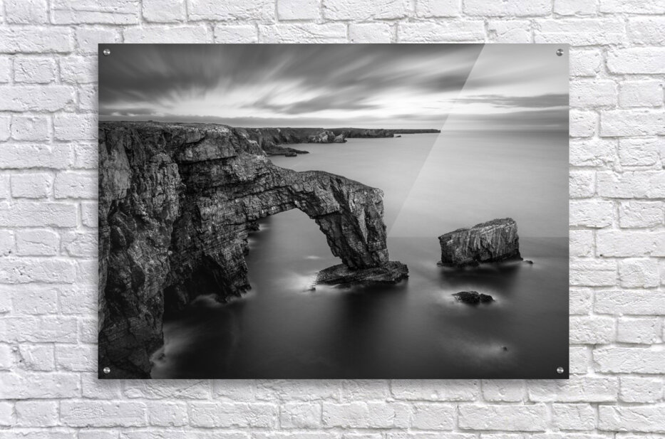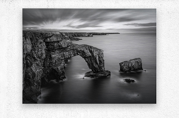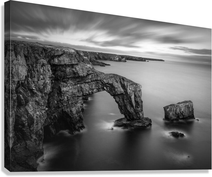 A long exposure photograph of the Green Bridge of Wales, presented in monochrome, showcasing a natural sea arch formed from Carboniferous Limestone. L...[+]