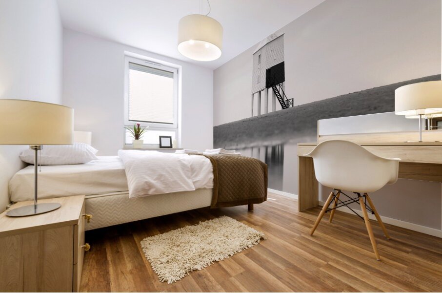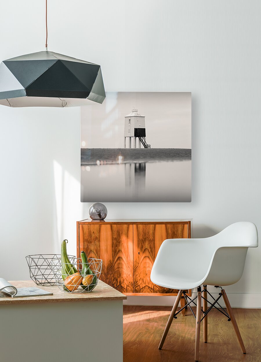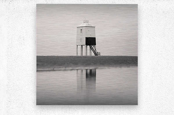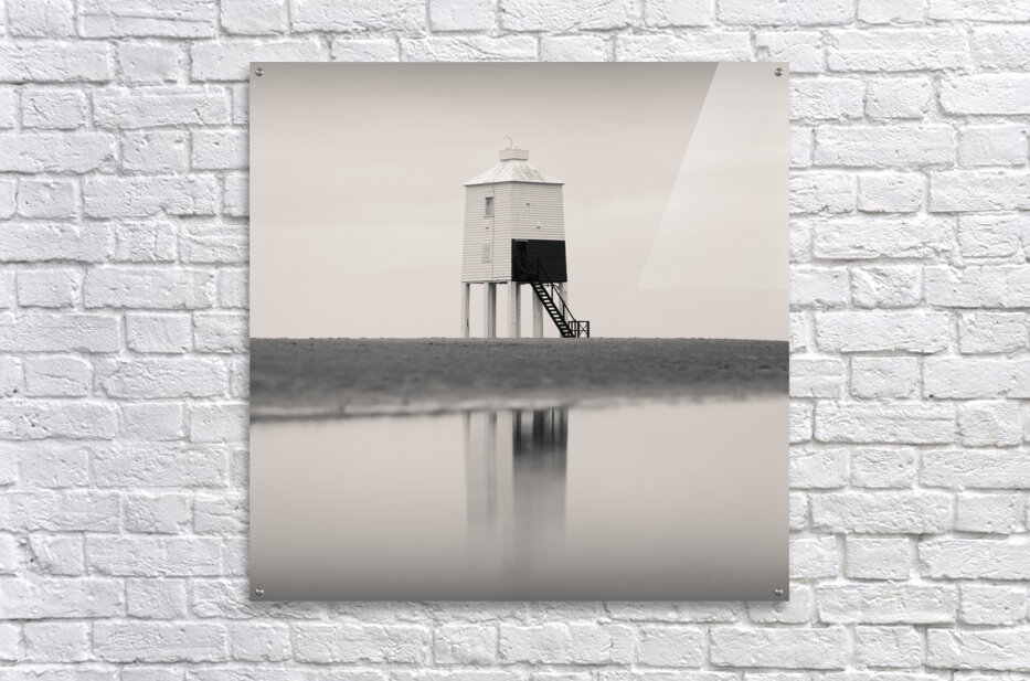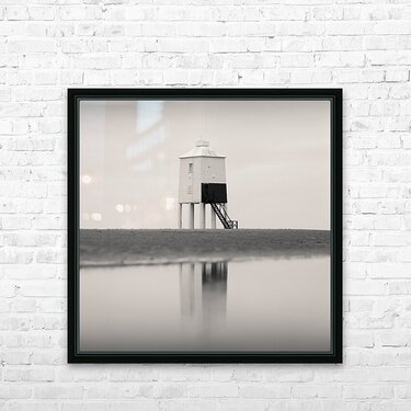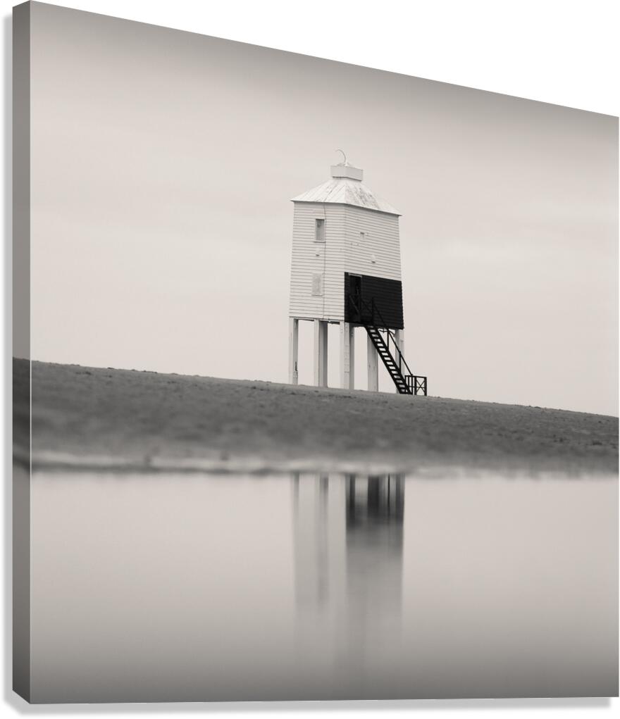 A minimalist monochrome photograph of the Burnham-on-Sea Low Lighthouse abstractly reflected in a serene tidal pool on the sandy shores of Somerset England. The stark contrast between the lighthouse its reflection and the surrounding open sky and sand creates a composition of pure simplicity and balance. A great photograph for those looking to bring a sense of calm and understated elegance into their environment.