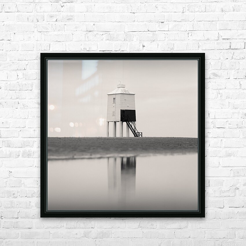 A minimalist monochrome photograph of the Burnham-on-Sea Low Lighthouse abstractly reflected in a serene tidal pool on the sandy shores of Somerset En...[+]