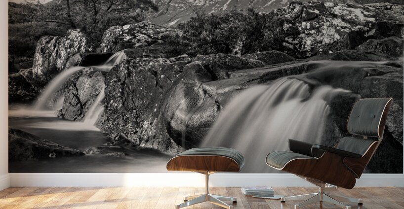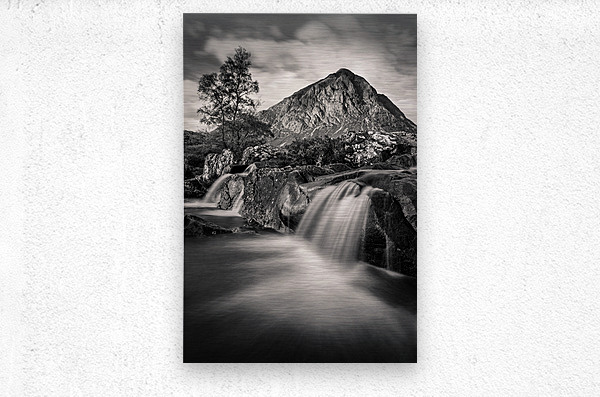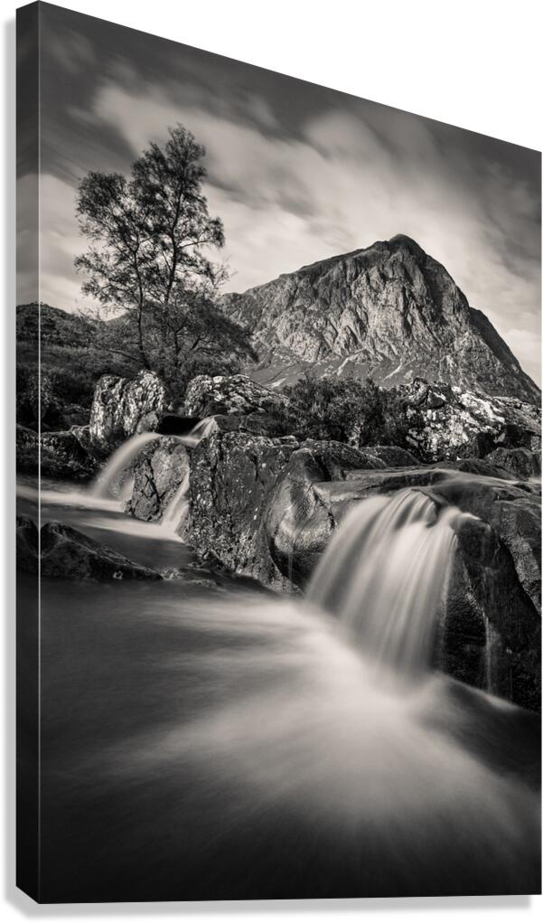 A moody monochrome long exposure photograph capturing the powerful cascade of a waterfall set against the dramatic backdrop of Buachaille Etive Mor mountain. Taken in Glen Etive Glencoe in the heart of the Scottish Highlands this image emphasizes the contrast between the flowing water and the rugged imposing landscape. The serene yet intense atmosphere evokes the wild beauty and isolation of Scotland’s natural scenery. A perfect photograph for those seeking to bring the essence of the Scottish Highlands into their home or office space especially those with a love for landscape photography or Scottish heritage.