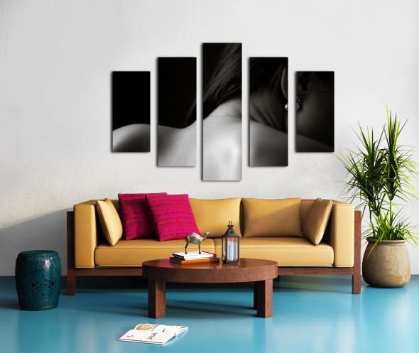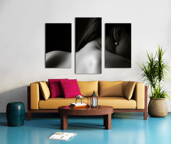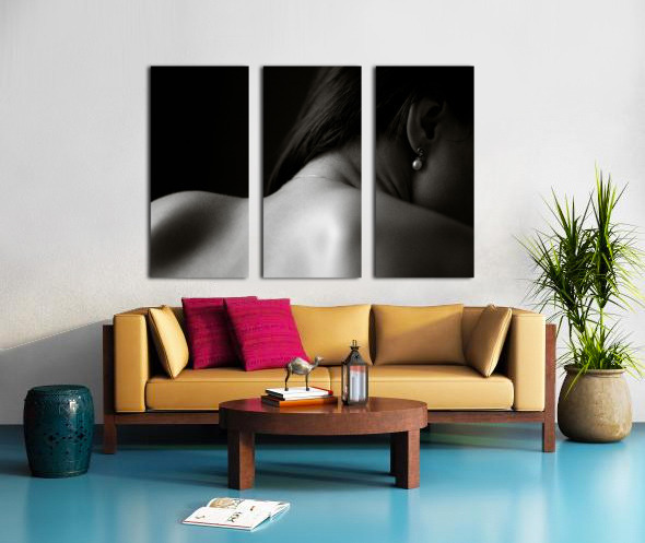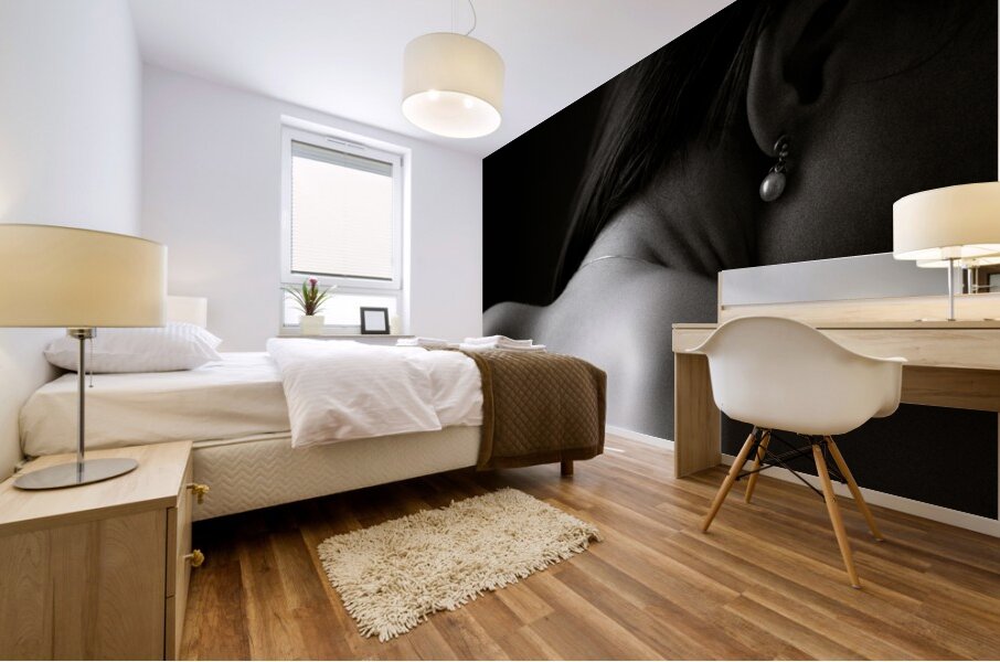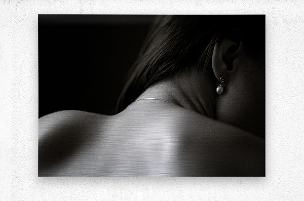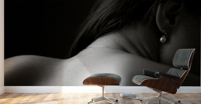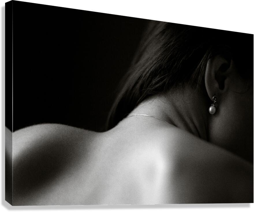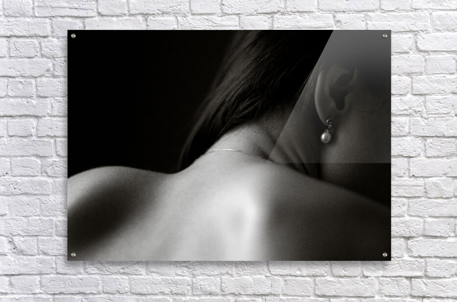 A monochrome photograph of an elegant nude study focusing on the graceful lines of a womans upper back. The composition highlights the delicate curve of her shoulder blades and the subtle contours of her neck with a simple pearl earring adding a touch of sophistication. The ideal photograph for collectors of fine art photography or those seeking a refined and tasteful piece for minimalist interiors.