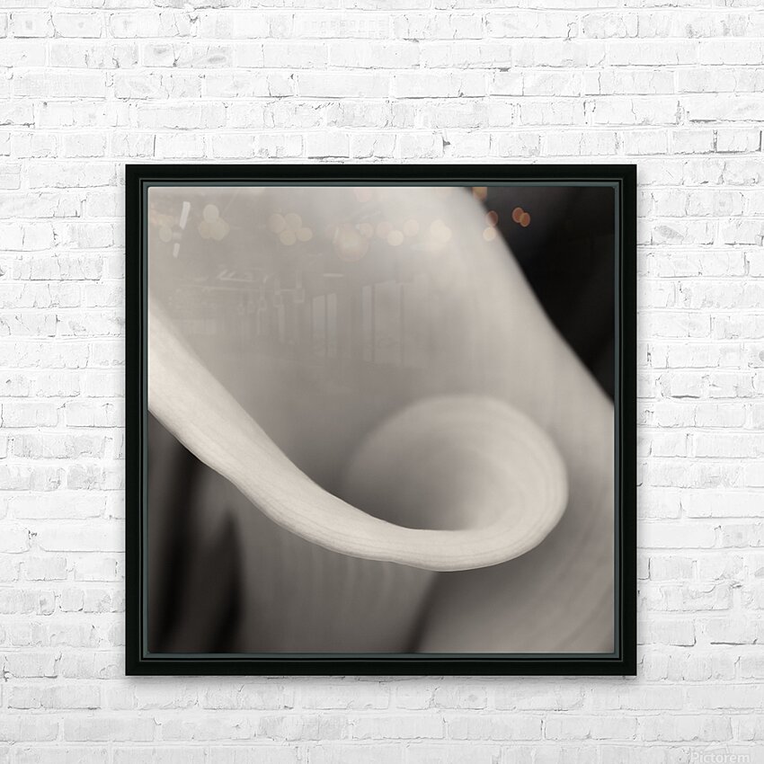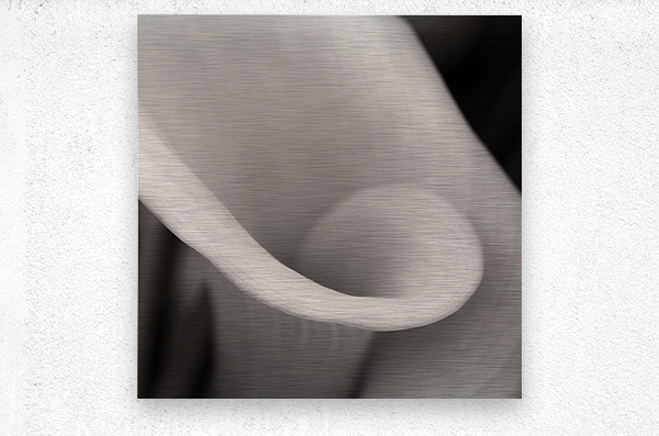 A monochrome semi-abstract close-up of the funnelled petals of a white calla lily, featuring intricate textures and subtle gradients. This detailed st...[+]