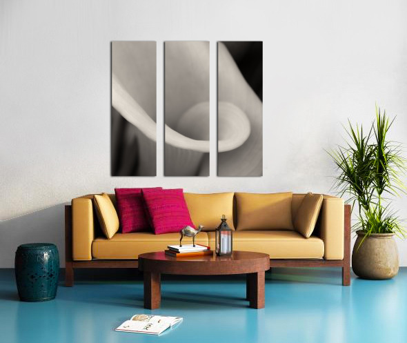 A monochrome semi-abstract close-up of the funnelled petals of a white calla lily, featuring intricate textures and subtle gradients. This detailed study captures the elegant curves and delicate structure of the flower, emphasizing its refined and minimalist beauty. The high-contrast black and white tones highlight the play of light and shadow on the smooth petals, creating a striking visual effect. A perfect photograph for those seeking a sophisticated and artistic addition to their collection.