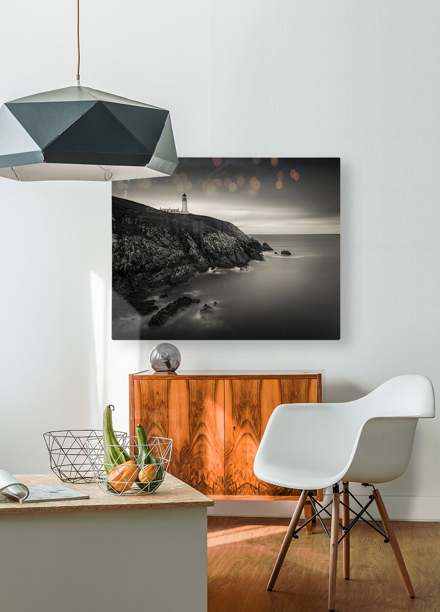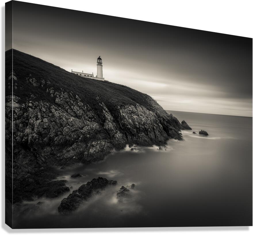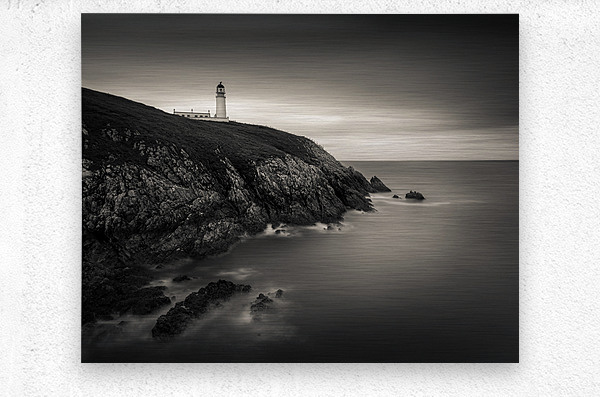 A monochrome, long exposure photograph of Tiumpan Head Lighthouse on the Isle of Lewis, Outer Hebrides, Scotland, showcasing the lighthouse amidst sof...[+]