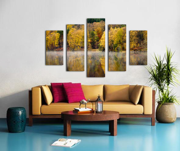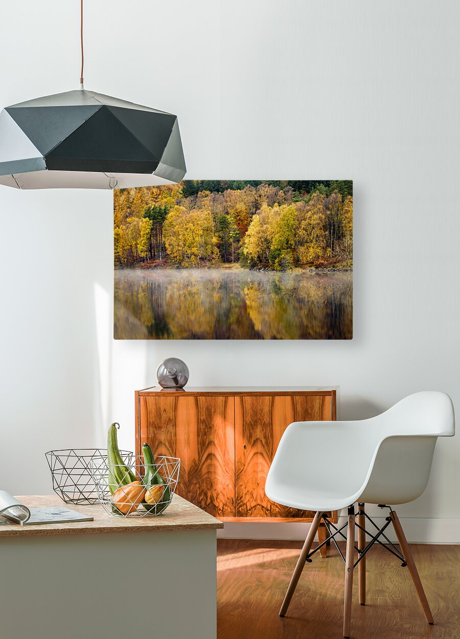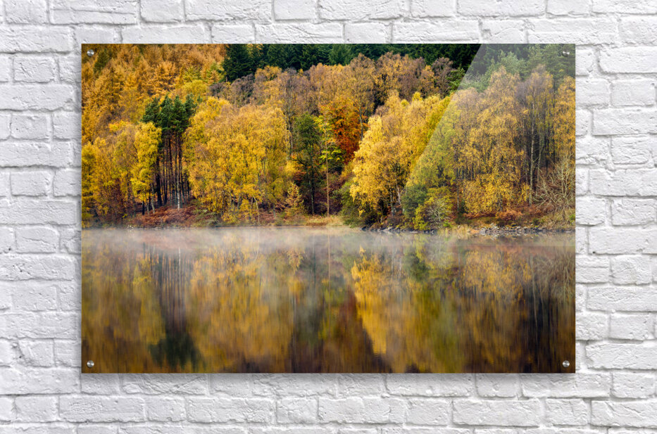 A serene autumn scene featuring trees with vibrant fall foliage reflected in the tranquil early morning waters of the River Tummel in Perth and Kinross, Scotland. The stillness of the river is accentuated by a delicate layer of mist hovering over the surface, adding an ethereal quality to the landscape. This photograph captures the calm and beauty of a crisp autumn morning in the Scottish Highlands. A perfect photograph for nature enthusiasts and landscape art collectors.