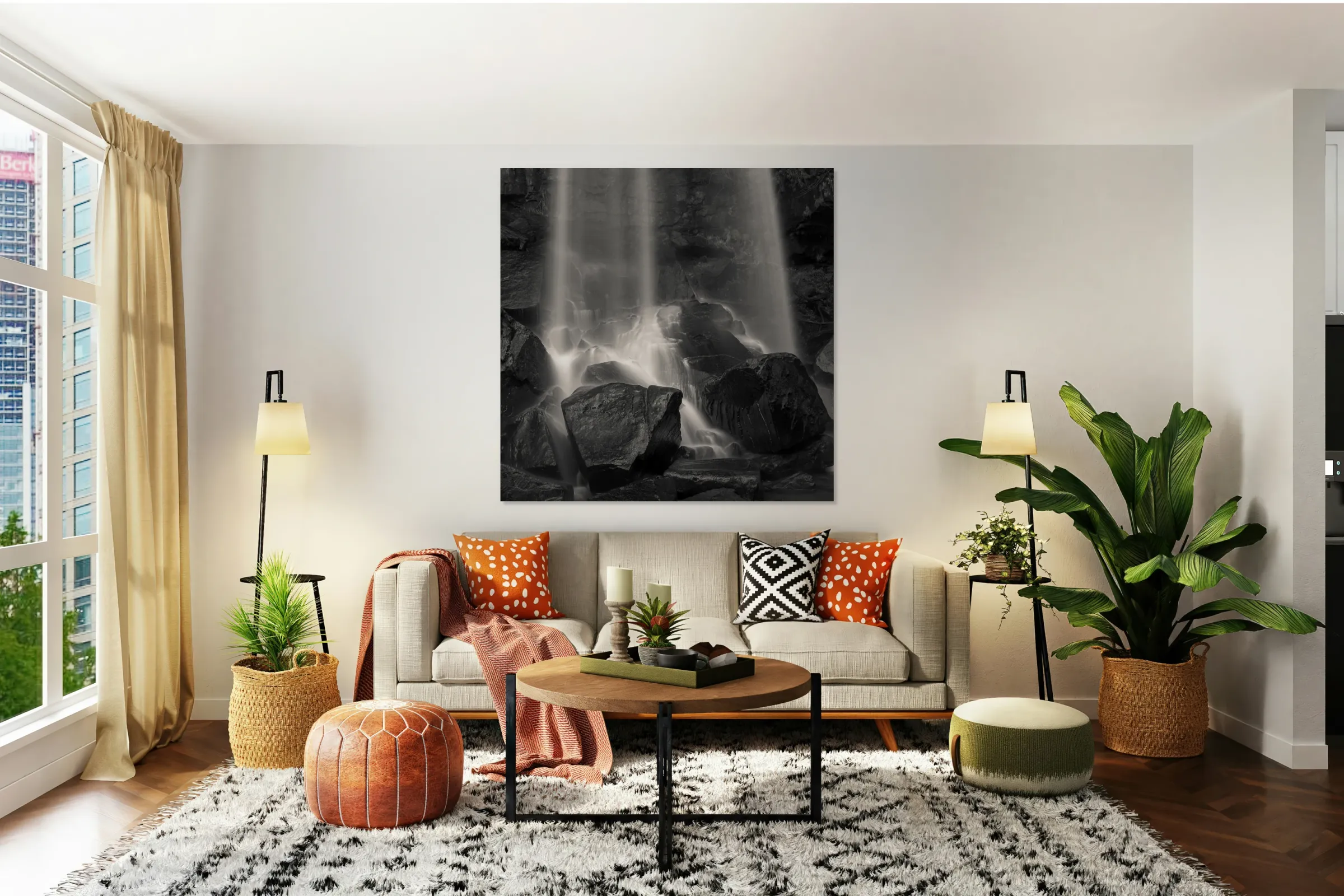 A monochrome long exposure photograph of Melincourt Waterfall, capturing the water flowing over rugged rocks at the base of the 80-foot falls. Located near Resolven in Neath Port Talbot, South Wales, this image highlights the dynamic movement and textures of the water as it meets Melin Court Brook. A great photograph for art collectors, landscape enthusiasts, or those seeking a unique visual of Welsh natural scenery.