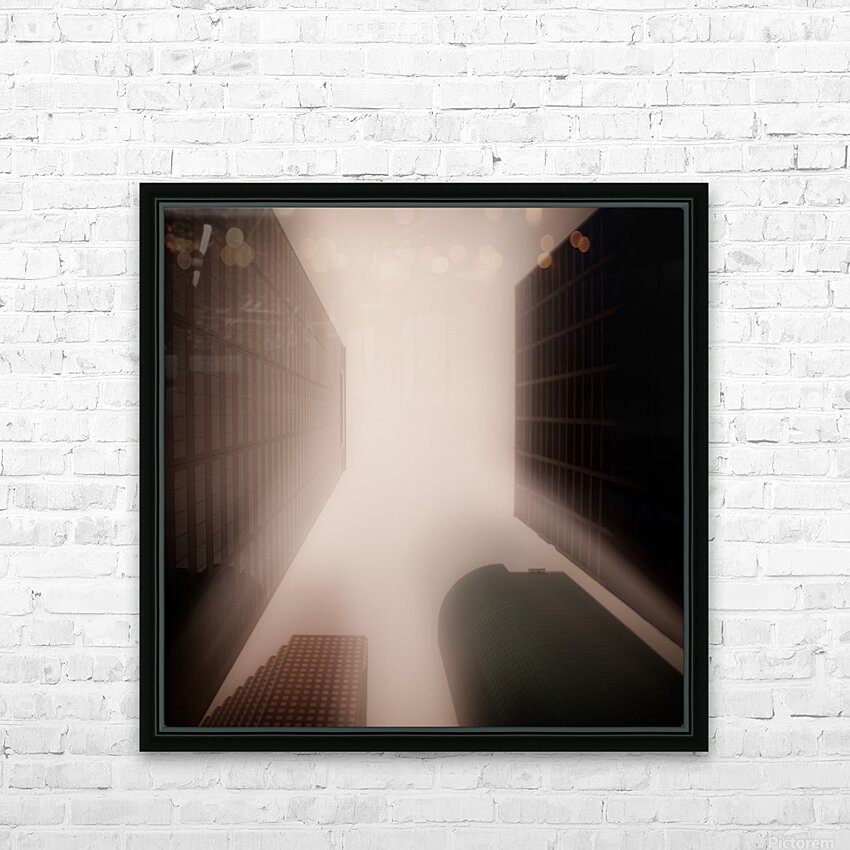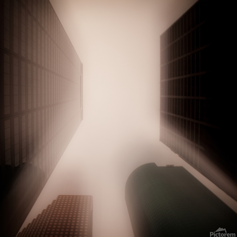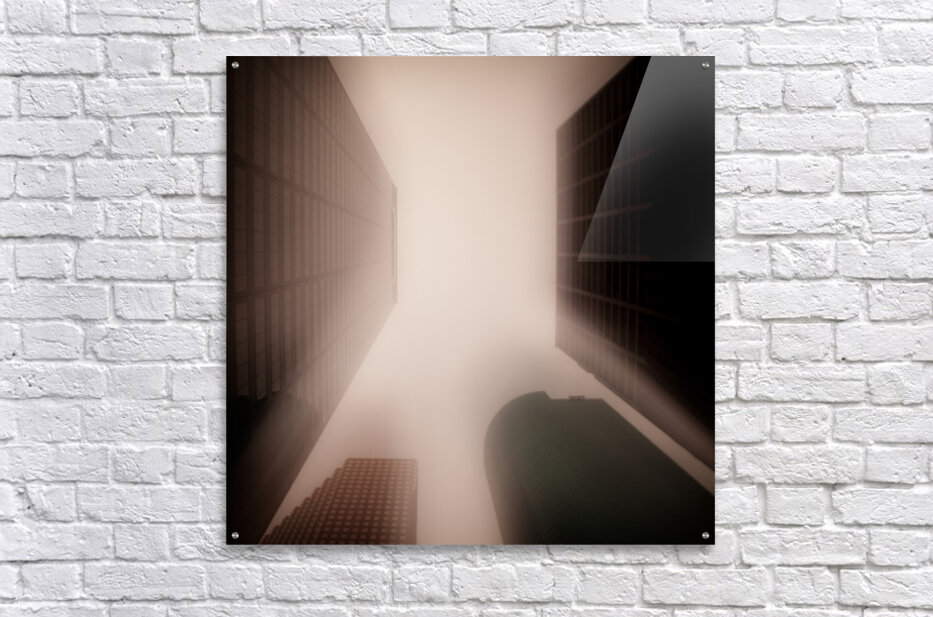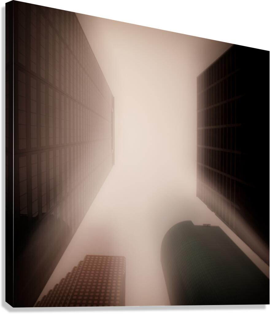 A semi-abstract long exposure photograph showcasing Houston city skyscrapers in Texas, USA. The image captures an upward view between the towering buildings, utilizing the Intentional Camera Movement (ICM) technique for a unique, dynamic effect. A great photograph for modern office spaces, architectural enthusiasts, or anyone seeking a distinct and artistic representation of urban landscapes.