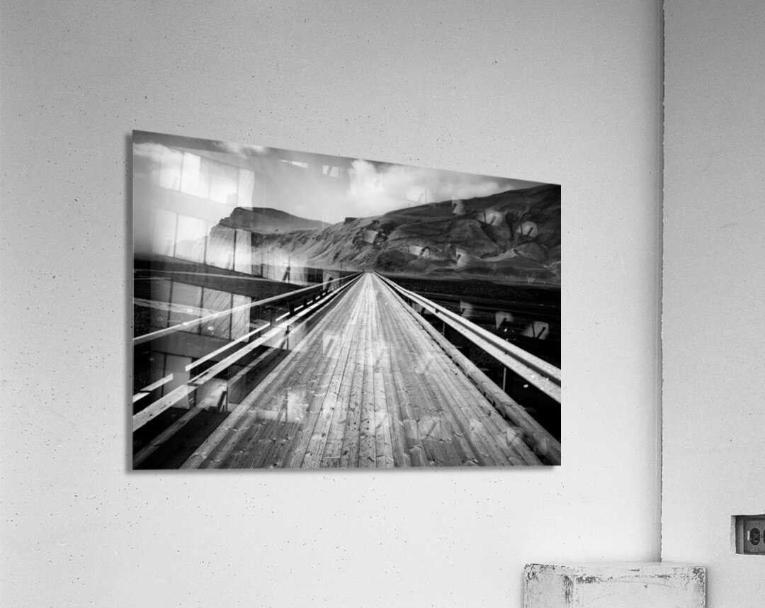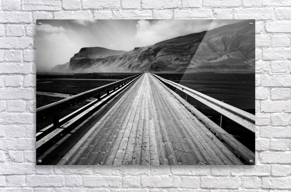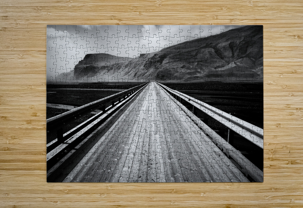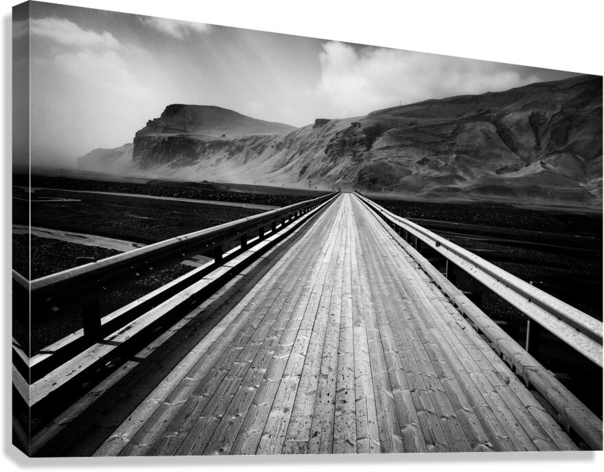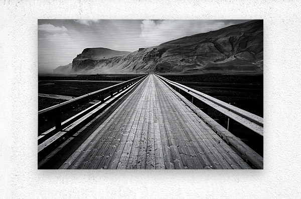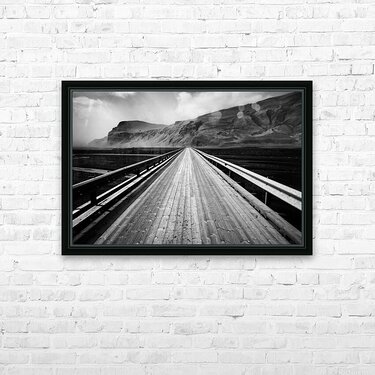 A monochrome photograph capturing the road leading to the Icelandic town of Vik with a wooden bridge crossing a remote landscape in southern Iceland. ...[+]