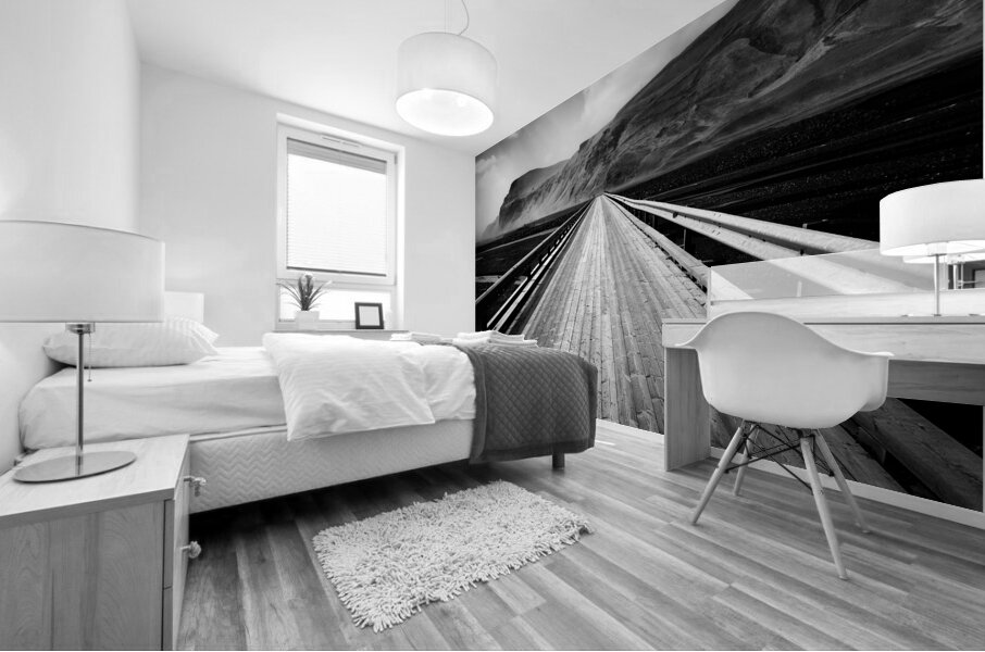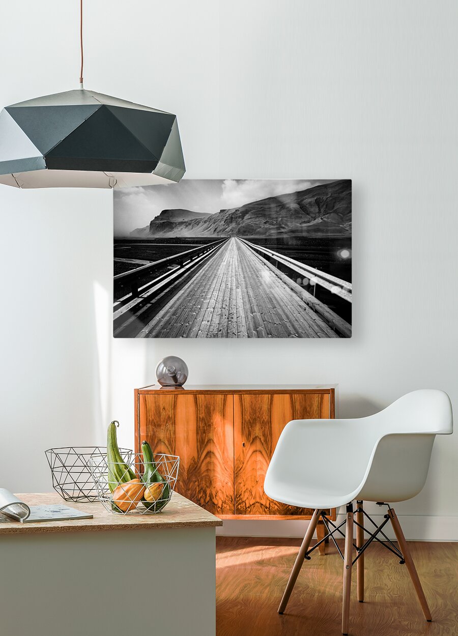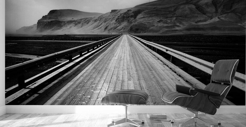 A monochrome photograph capturing the road leading to the Icelandic town of Vik with a wooden bridge crossing a remote landscape in southern Iceland. The quiet open road and simple bridge stand out against the stark black-and-white backdrop highlighting the vastness of the surrounding terrain. A perfect photograph for those drawn to minimalism isolation or the raw beauty of Icelands landscapes.